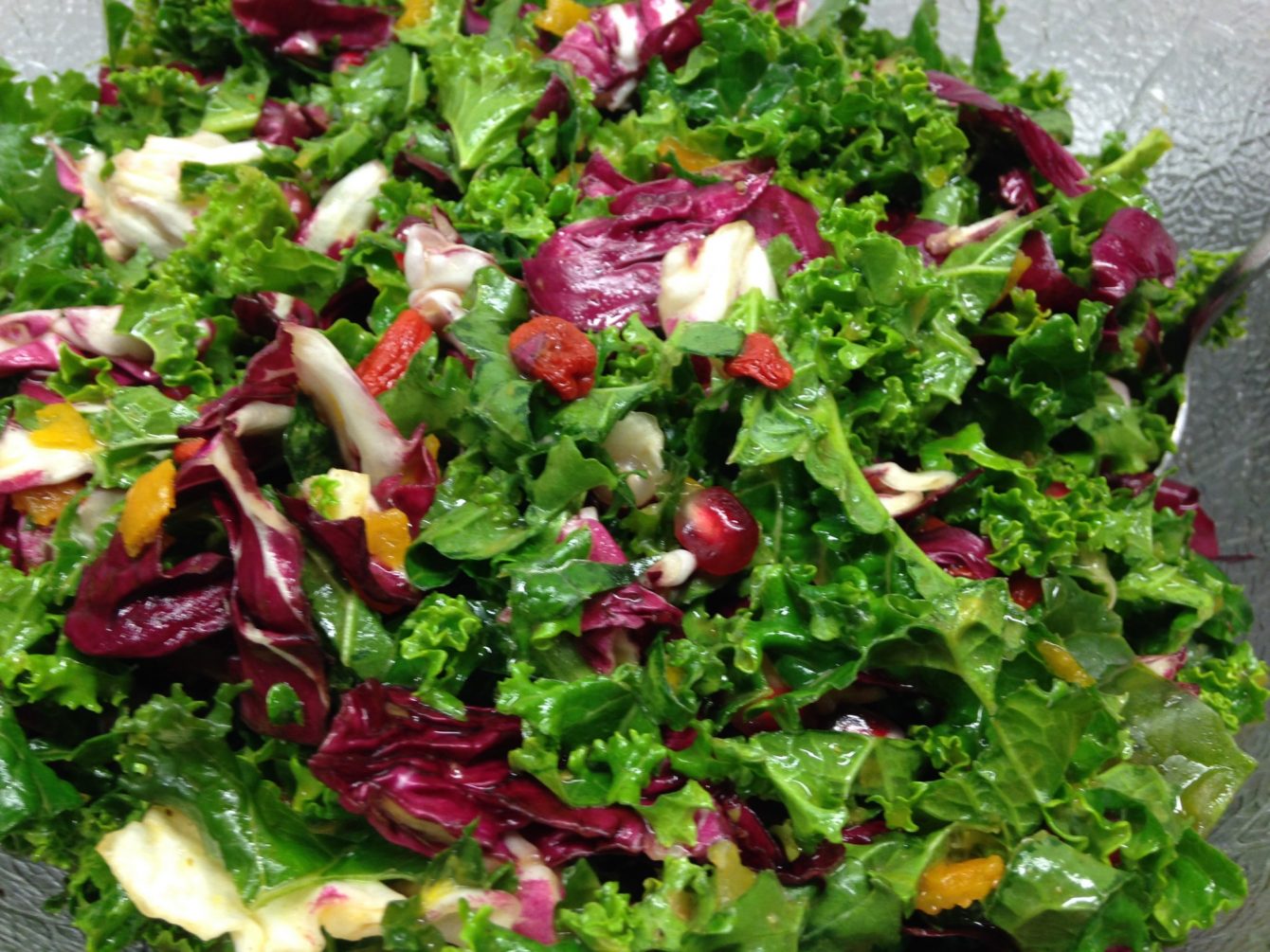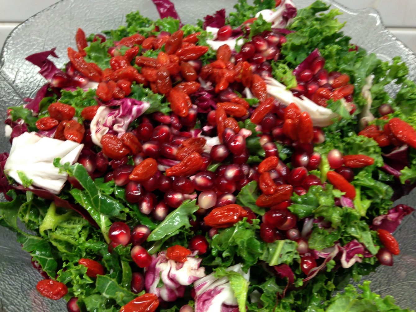 Das Rezept für den Radicchio Grünkohl Salat mit Goji-Beeren und Granatapfel-Kumquat-Dressing