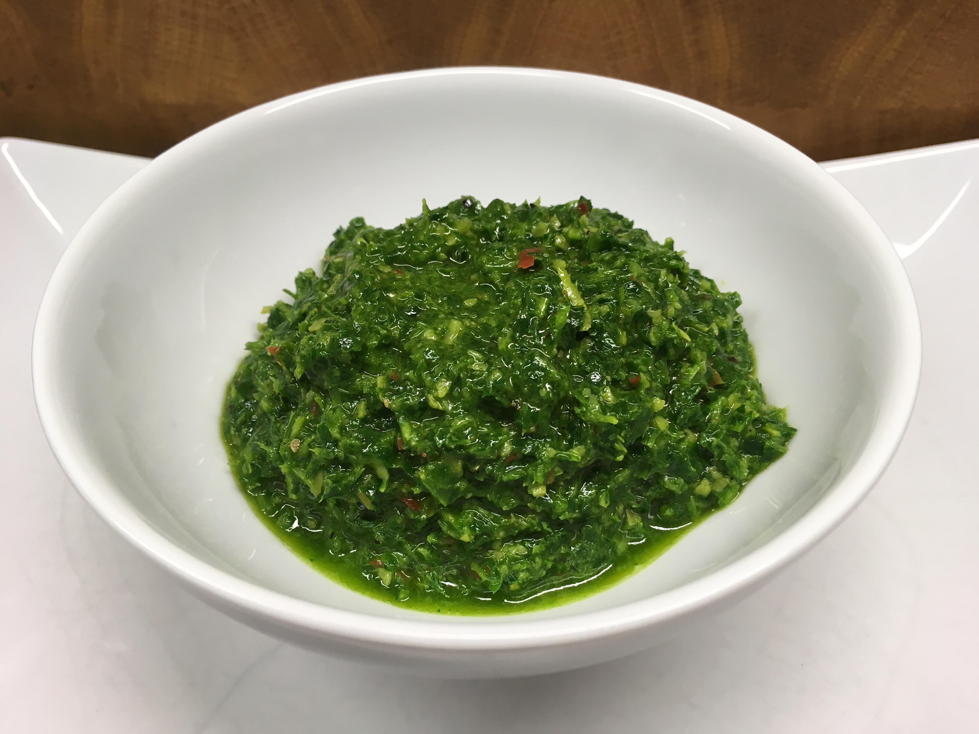- Alle Zutaten für die Gremolata Inn einem Mixer oder Foodprozessor zu einer groben Pesto-ähnlichen Konsistenz verarbeiten und mit Zitronensaft, Salz und Pfeffer abschmecken.