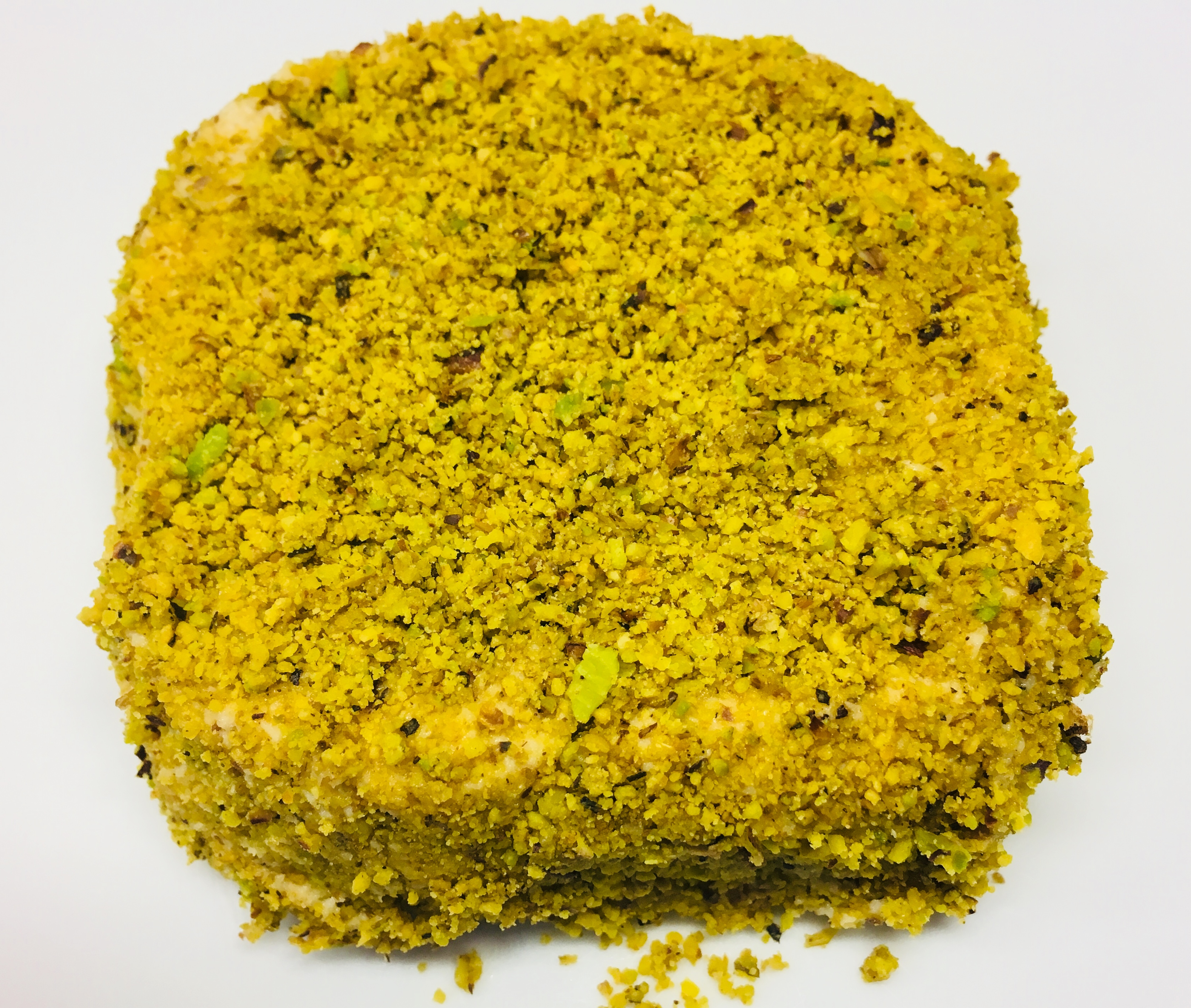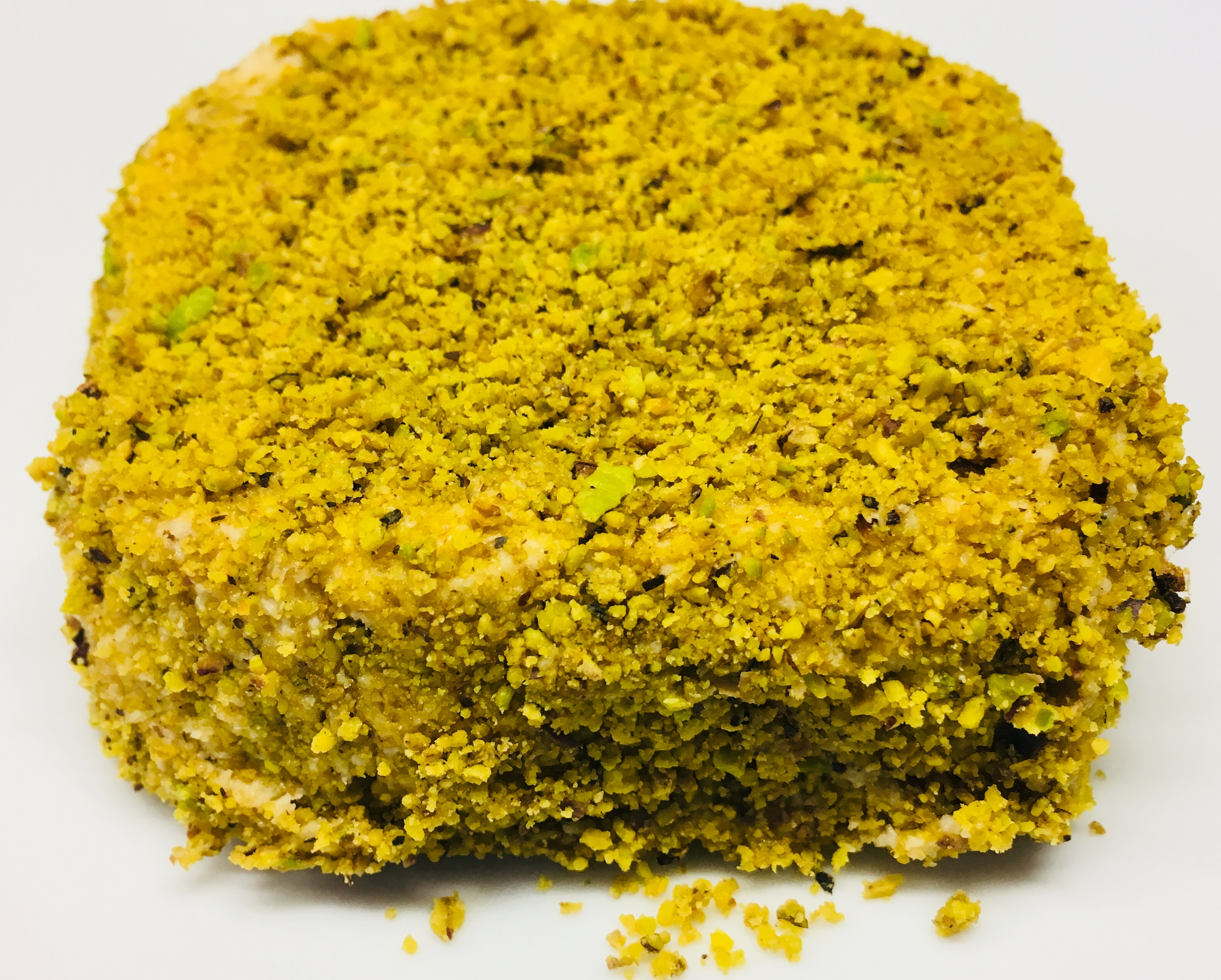 Dieser Cashew Käse mit Pistazien und Minze ist ein roh veganer „Käse“ aus Cashewkernen, gefestigt mit Apfelpektin und ummantelt mit einer Kruste aus gemahlenen Pistazien und Minze.