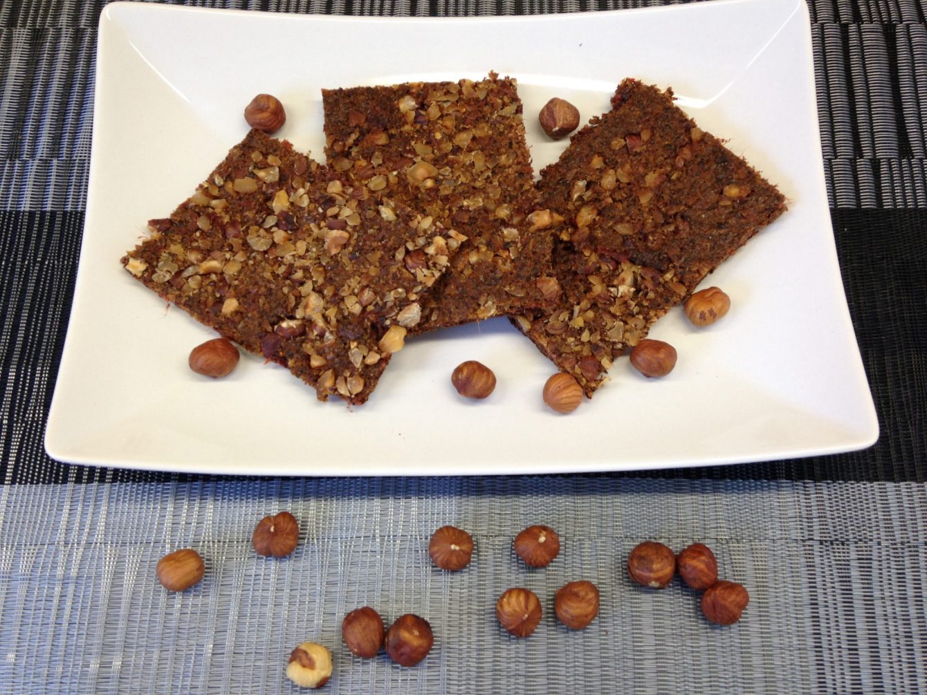 Alle Zutaten, bis auf die Haselnüsse in einem Mixer oder Foodprozessor zu einer zähen Teigmasse verarbeiten. Den Teig für das Rohkost Brot auf einem Backblech mit Backpapier verstreichen und mit den gehackten Haselnüssen bestreuen.