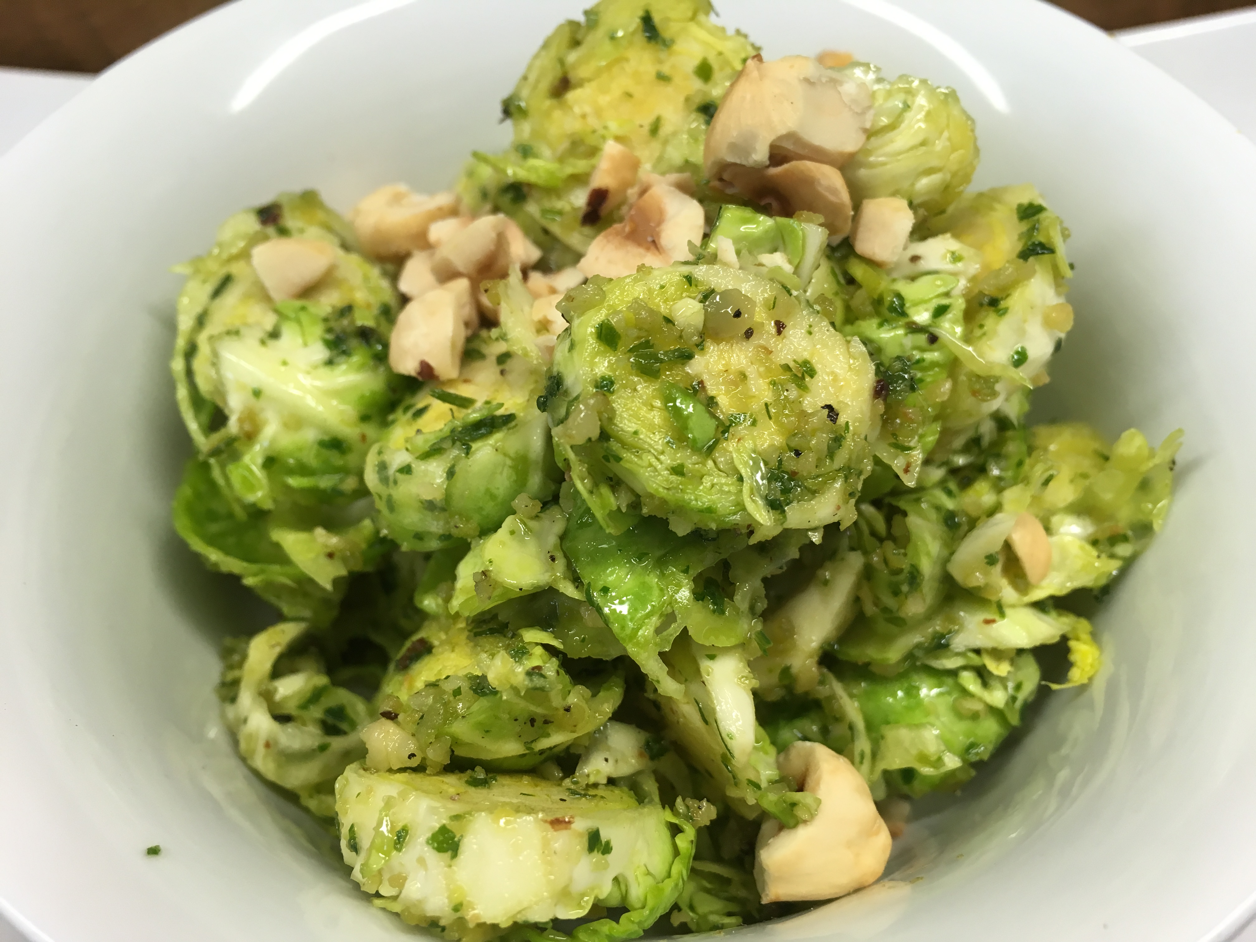 Die Inspiration zu diesem Rezept habe ich von Ingrid Weithers-Baratis Shredded Brussels Sprouts and Hazelnut Pesto with Fresh Tomatoes. Ich fand die Kombination von Rosenkohl mit Haselnuss Pesto toll und da ich Rosenkohl im Kühlschrank und auch noch ein selbstgemachtes Haselnuss-Pesto im Keller hatte, war das für mich die perfekte Rezeptidee. Mein Haselnuss-Pesto und meine Zubereitungsart ist allerdings etwas anders. Statt Tomaten kombiniere ich Granatapfelkerne als Fruchtkompontente. Die Idee mit den Granatapfelkernen kam mir erst beim Essen, also, nachdem ich die Bilder gemacht habe, daher sind Sie hier nicht mit abgebildet. Sie ergeben aber auch für das Auge einen schönen komplementären Farbtupfer als Kontrast zum Einheitsgrün.