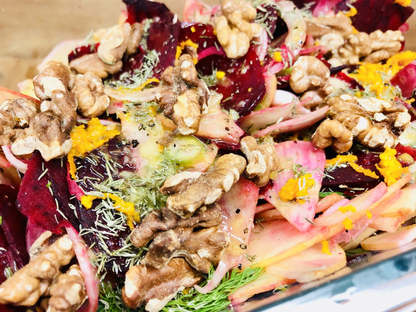 Im diesem Rezept kombiniere ich Fenchel mit rote Bete und Walnüsse und würze den Salat mit einer fruchtigen Vinaigrette aus Orangensaft, Walnuss Öl, weißem Balsamico, frischem Ingwer, Honig und Senf.