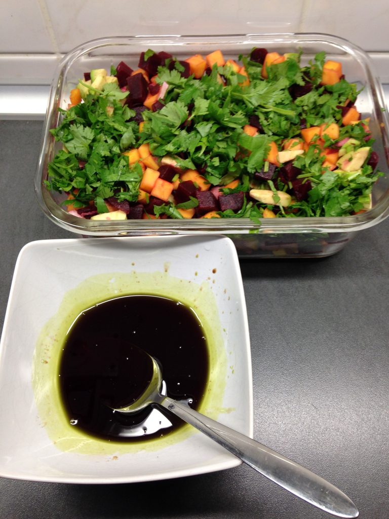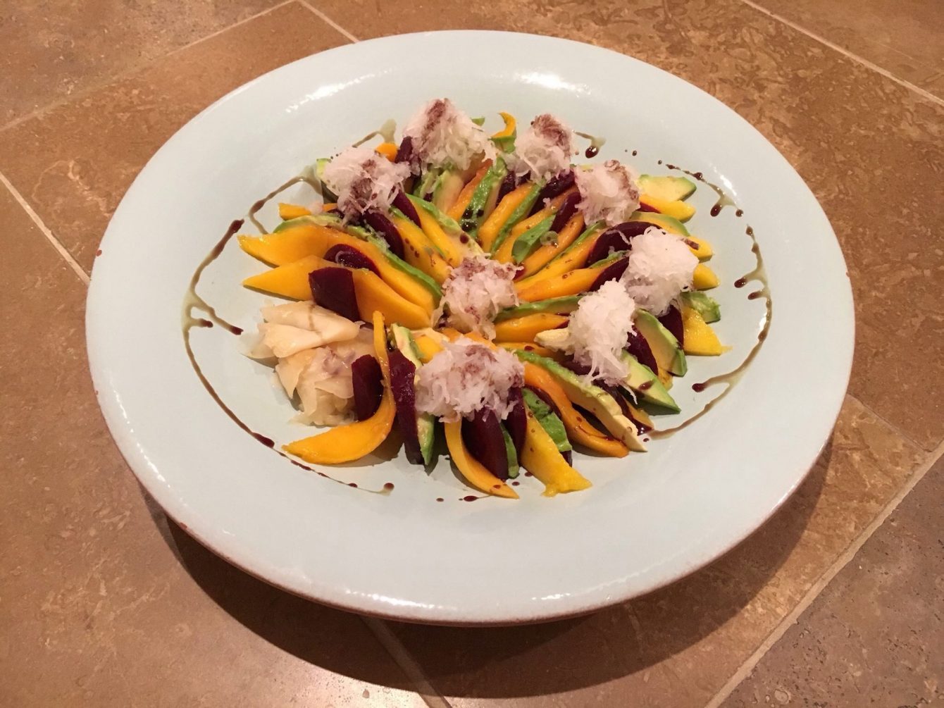 Rote Bete Mango Avocado Salat mit Rettich und Soja Wasabi Gari Ingwer Dressing und Koriander