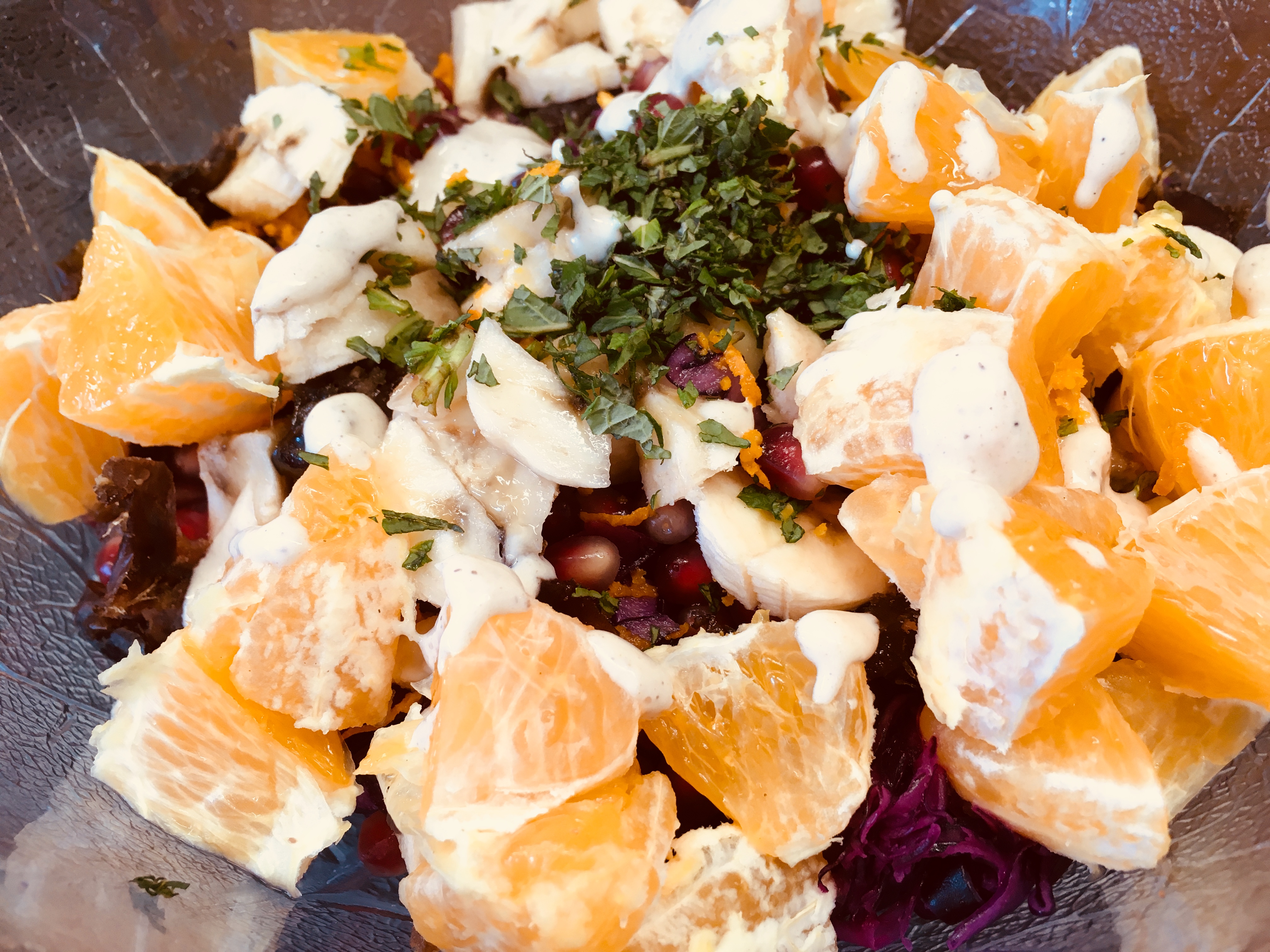 Das Rezept für den Rotkohl Salat mit Datteln, Orangen, Granatapfelkernen und Mandel Ingwer Miso Dressing