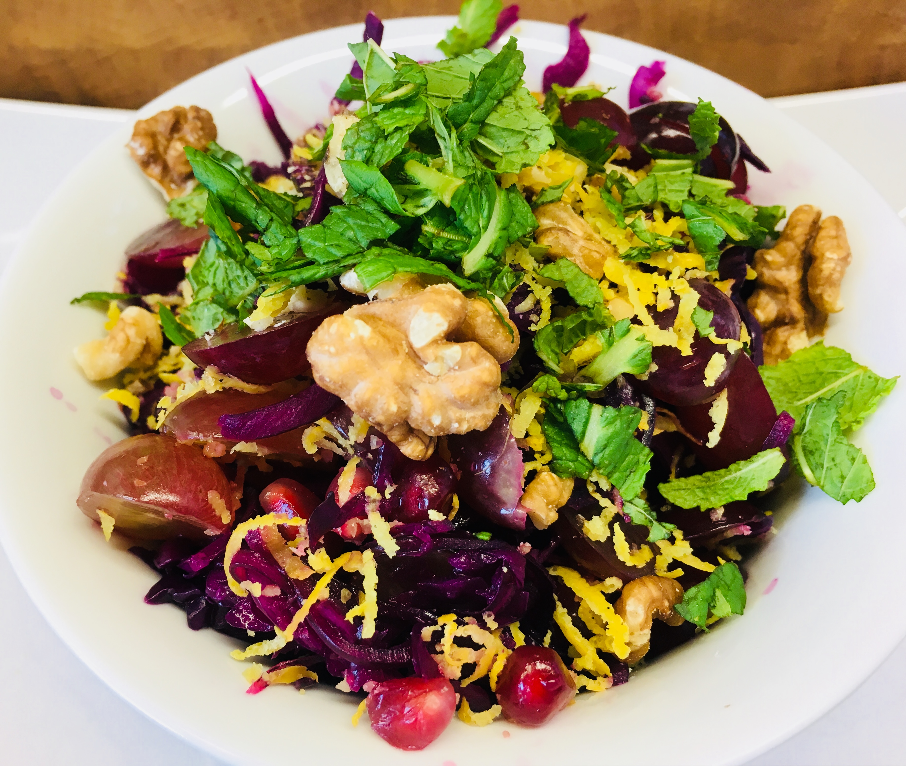 - Salat mit dem Dressing vermischen und gut ziehen lassen. Mit gehackten Walnüssen, Minze und Zitronenzesten garnieren und genießen.