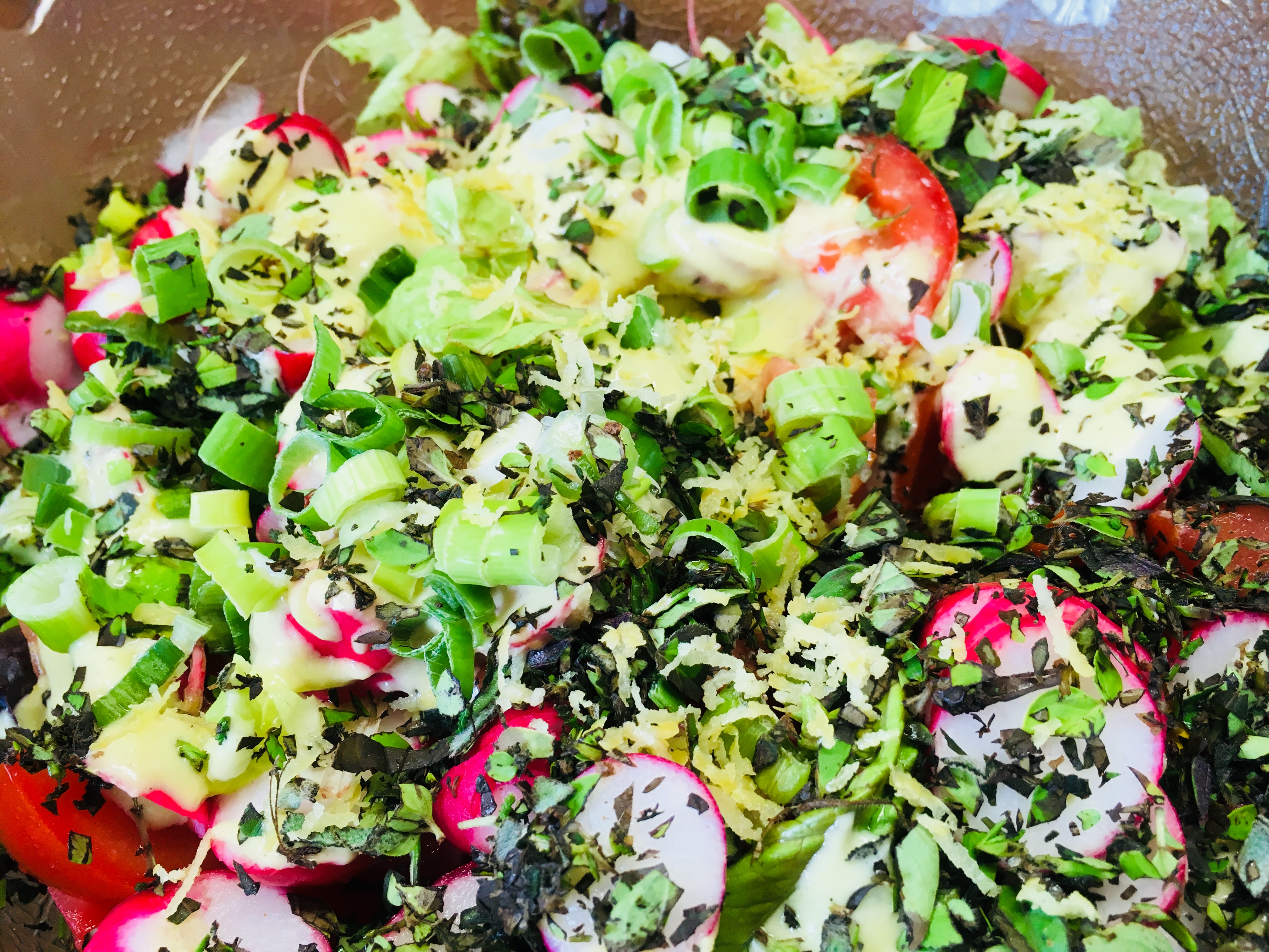 Das Dressing schmeckt auch zu anderen Blattsalaten oder nur zu Tomaten und Radischen oder Rettich oder, was auch immer Ihr dazu kombinieren wollt.