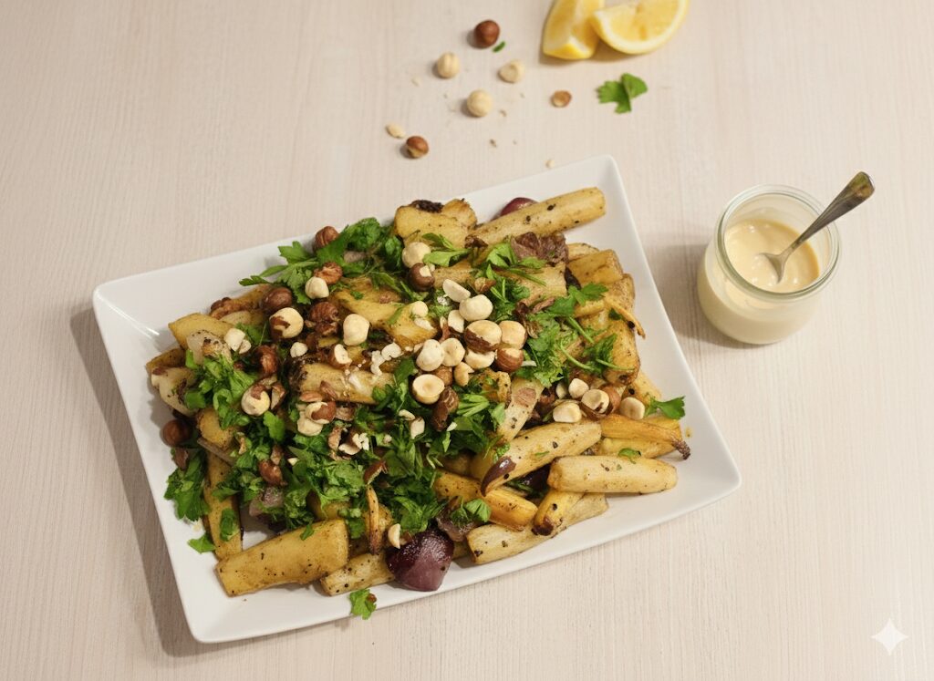 Das Rezept: Geröstete Schwarzwurzel und Pastinaken mit Haselnüssen & Zitronen-Tahini-Sauce