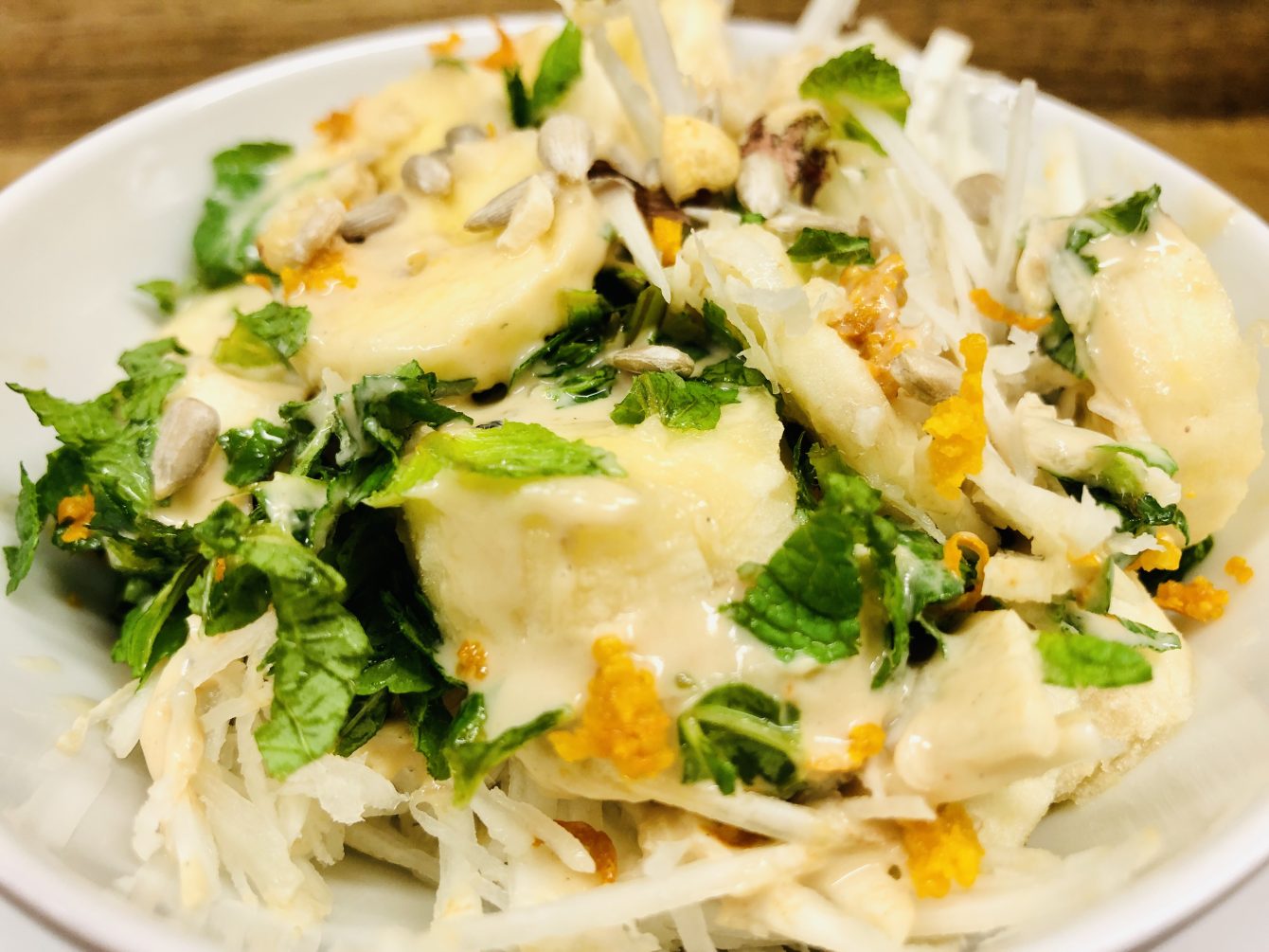 - Für das Dressing die Zitrone auspressen und zusammen mit dem Mandelmus, Ahornsirup und Ingwer vermischen und mit Mandelmilch verdünnen bis die gewünschte Konsistenz erreicht ist. Mit Pfeffer und Salz abschmecken.