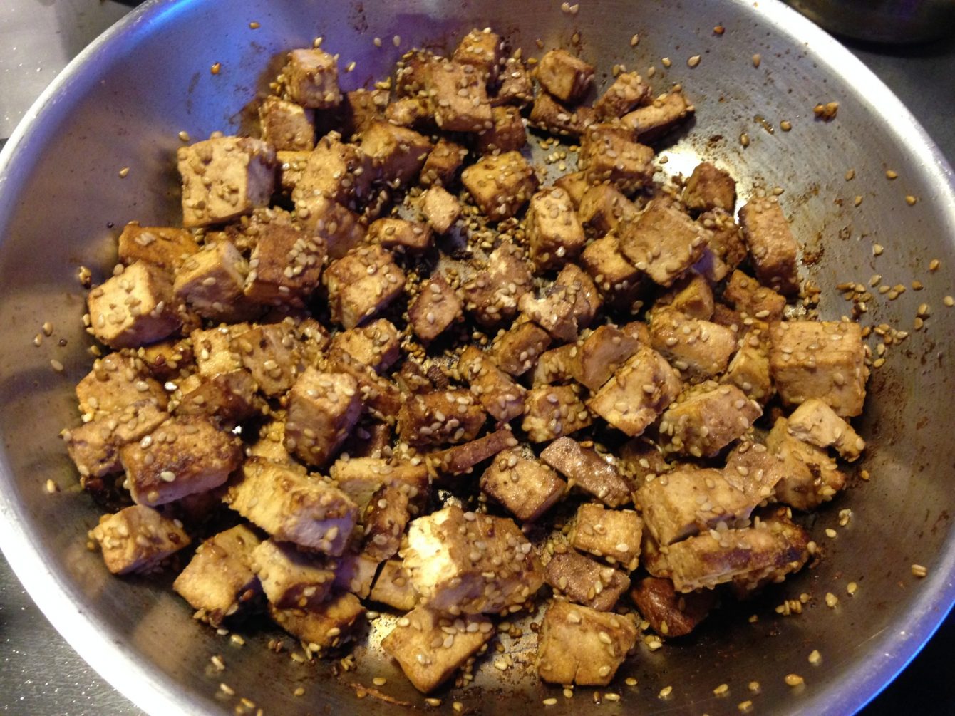 - In der Zwischenzeit in einer zweiten Pfanne den Tofu aus der Marinade geben und ebenfalls anbraten, bis er die gewünschte Konsistenz hat.