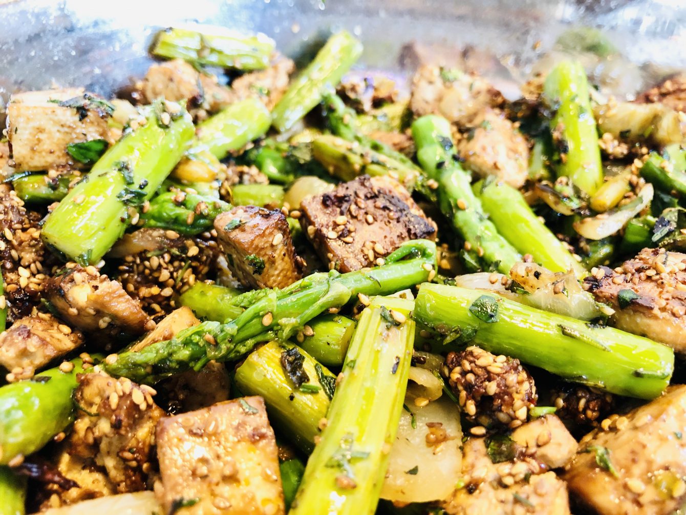 Dieser gebratene Grüne Spargel mit knusprigem Sesam Tofu in einer köstlichen Chili Marinade ist eine asiatische Variante für das leckere Kaisergemüse.