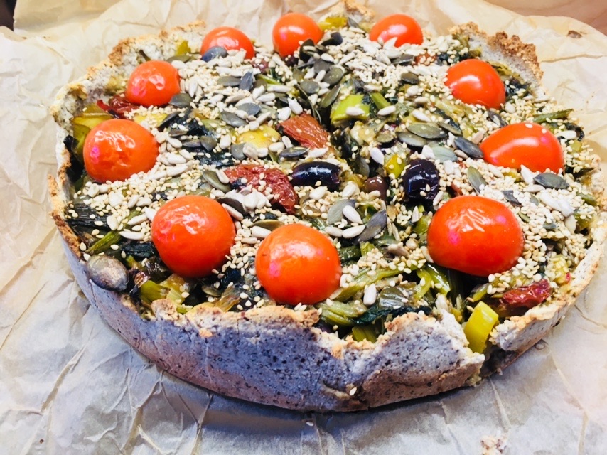 Diese Spinat Tarte mit Oliven und getrockneten Tomaten, frischen Kräutern und Gewürzen ist vegan und glutenfrei.