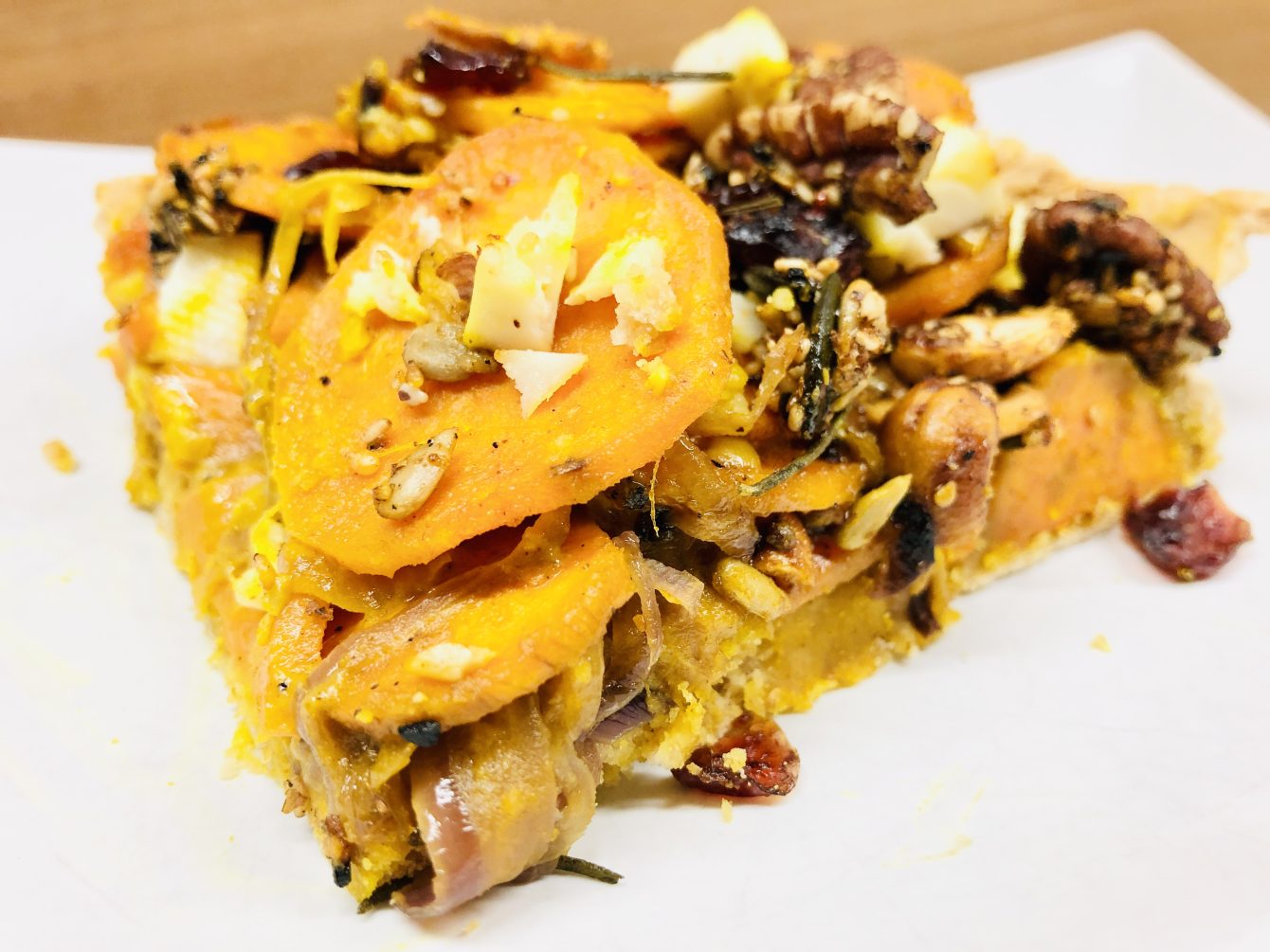 Mit einer Mandel Miso Creme, karamellisierten Zwiebeln sowie Ingwer, Kurkuma, Muskat und Cayennepfeffer und Dukkah Gewürzen bringt die Süßkartoffel Tarte viele leckere Aromen und gesunde Nährstoffe auf den Tisch.