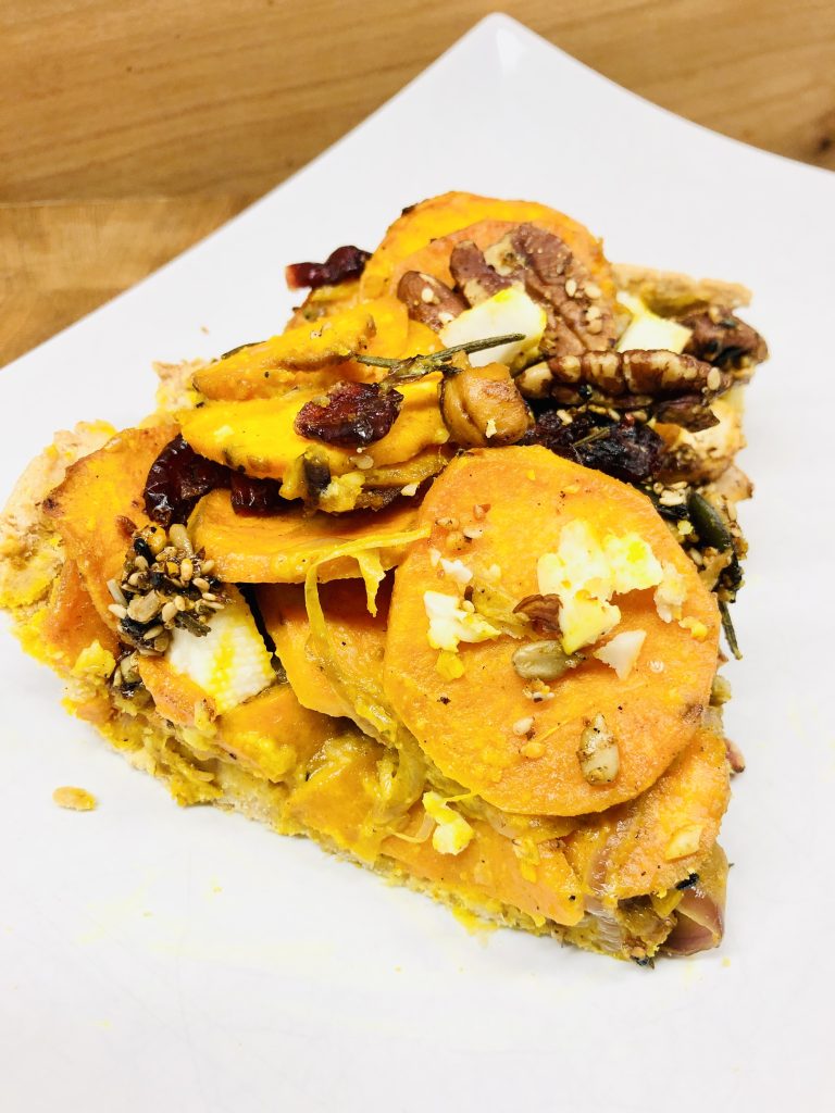 Die Süßkartoffel Tarte mit Dukkah Nüssen und Cranberries ist ein perfektes Gericht für die kalte Jahreszeit.