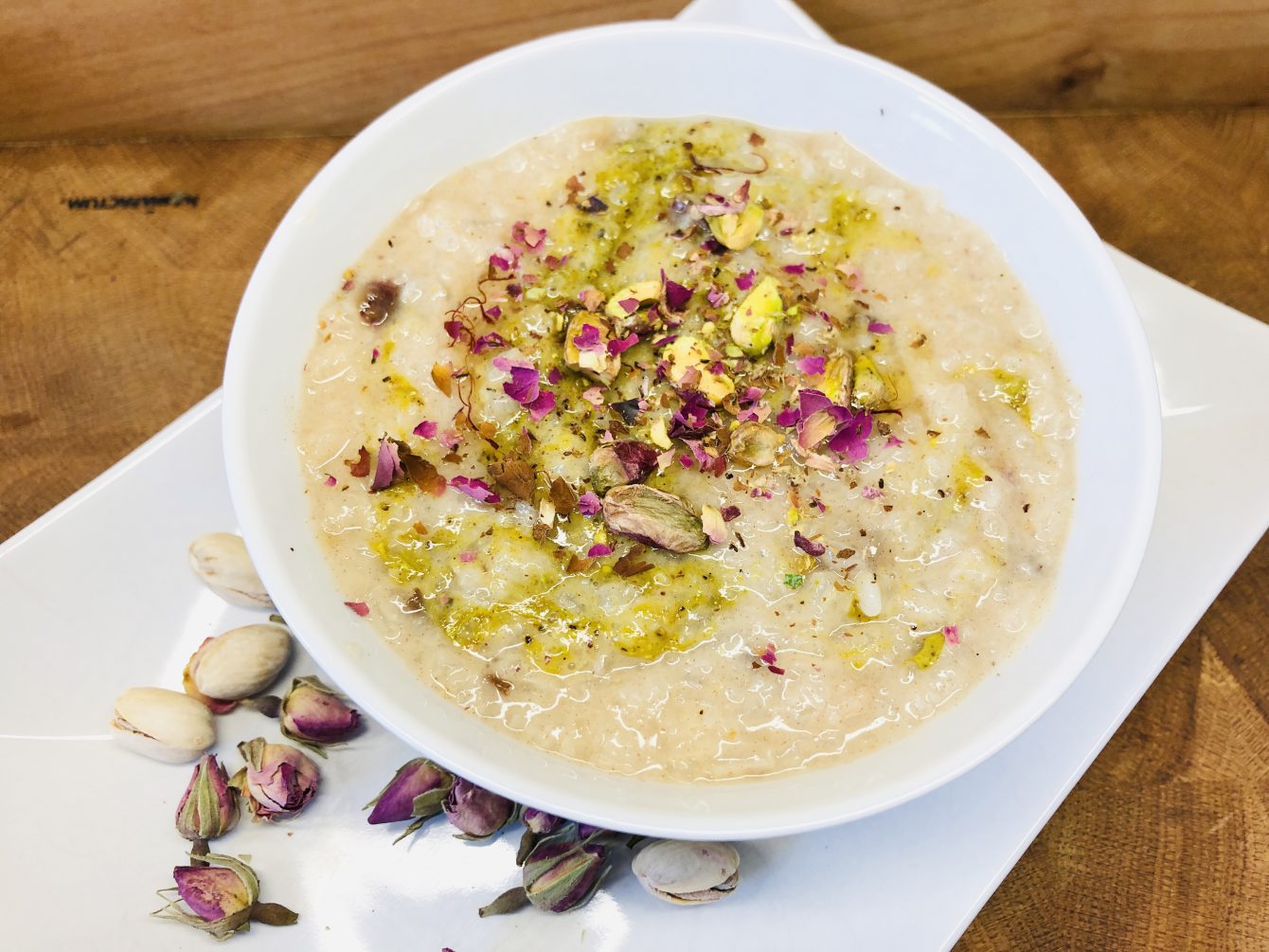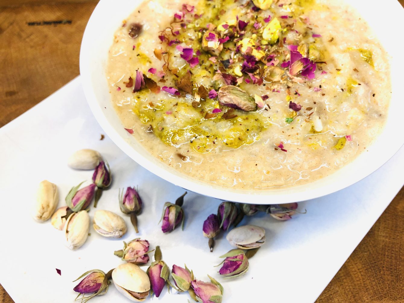 Das Rezept für den syrischen Reis Pudding mit Pistazien und Rosenblättern