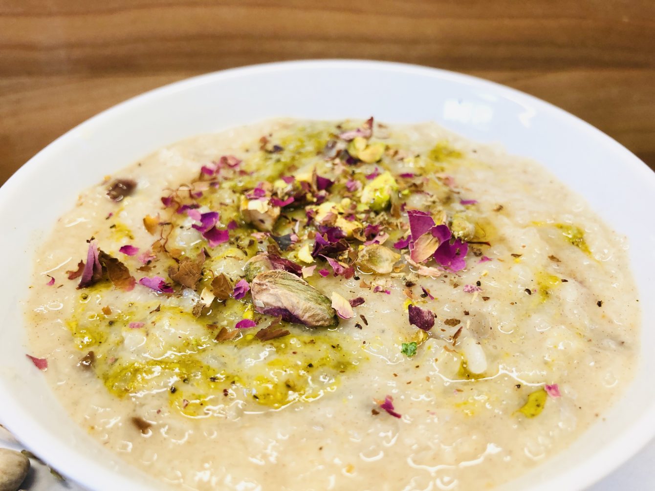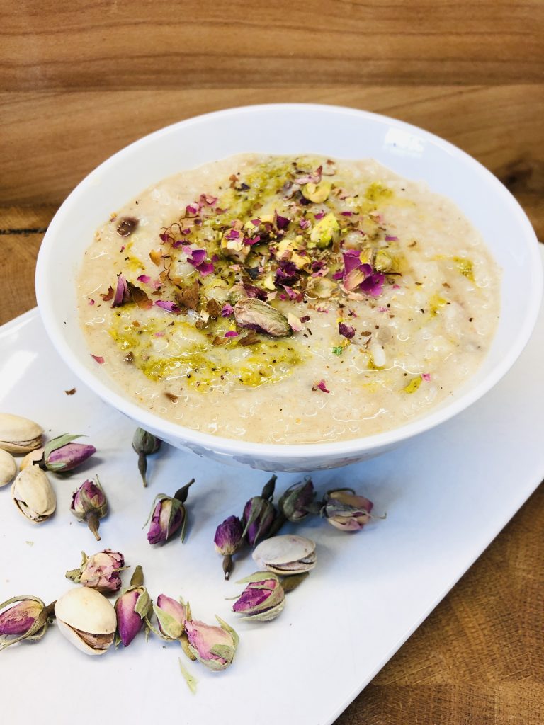 Dieser syrische Reis Pudding mit Pistazien und Rosenblättern ist ein leckeres cremiges Dessert oder eine Alternative zum klassischen Frühstücks-Porridge.