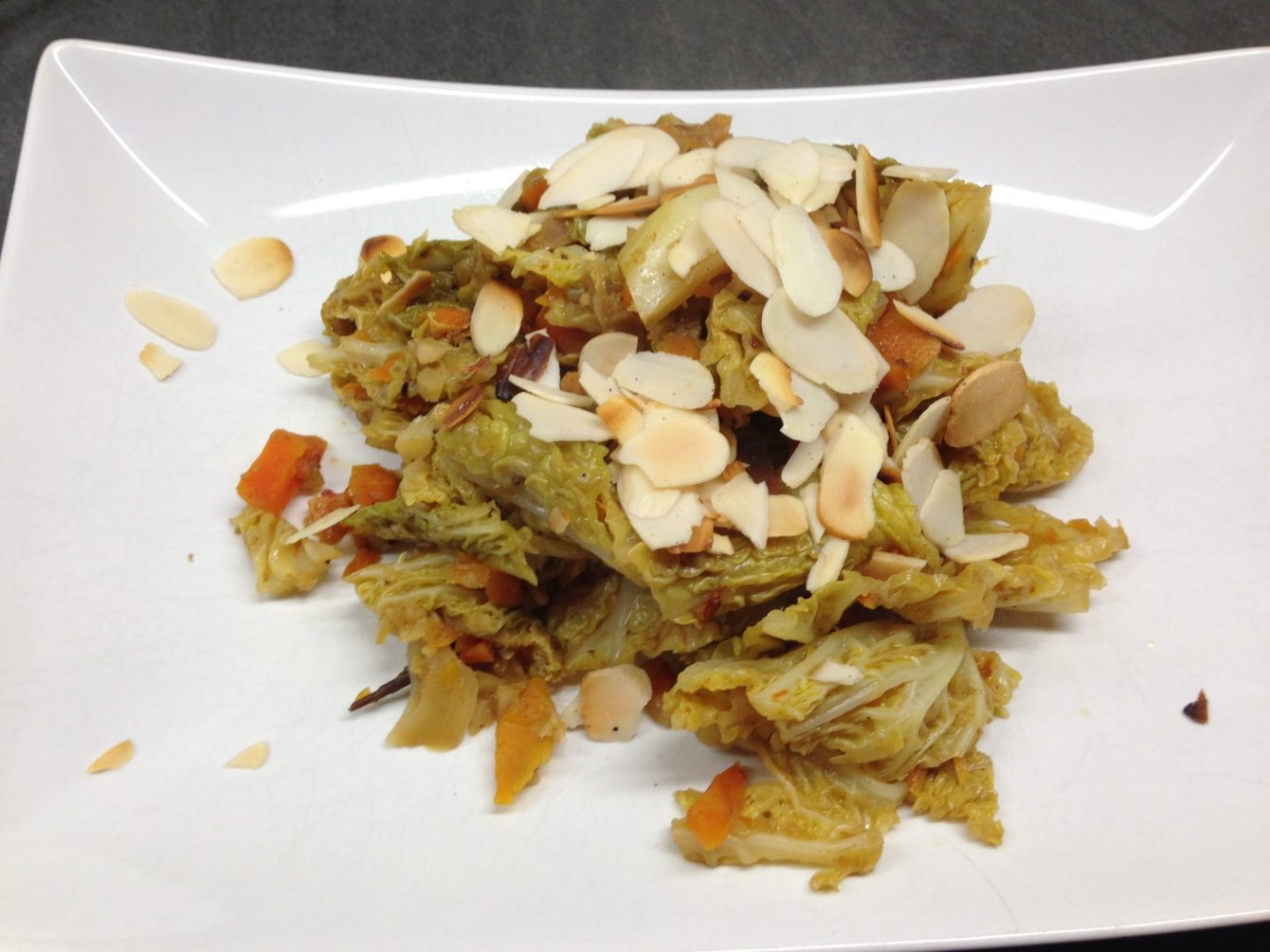 Möhren und Zwiebeln schälen und grob hächseln. Aprikosen fein würfeln. In einer Pfanne in etwas Olivenöl dünsten, aber die Möhren noch bißfest lassen.