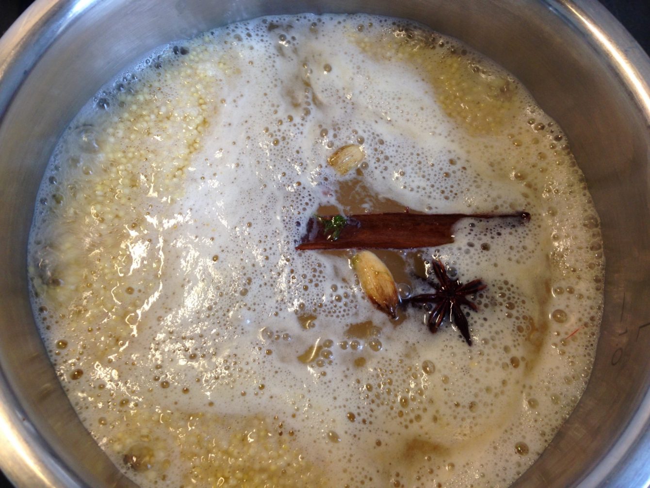 Das Obst mit der Hirse vermischen und mit der warmen Reismilch übergießen.