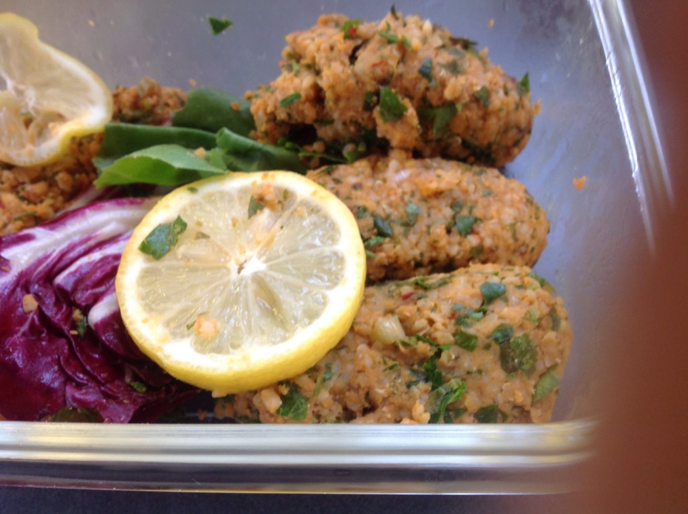 Zwiebeln, Knoblauch und Chili fein hacken und in Olivenöl glasig dünsten, zu der Linsen-Bulgur Mischung geben. Pasten und Gewürze, Olivenöl und Zitronensaft hinzufügen und untermischen.