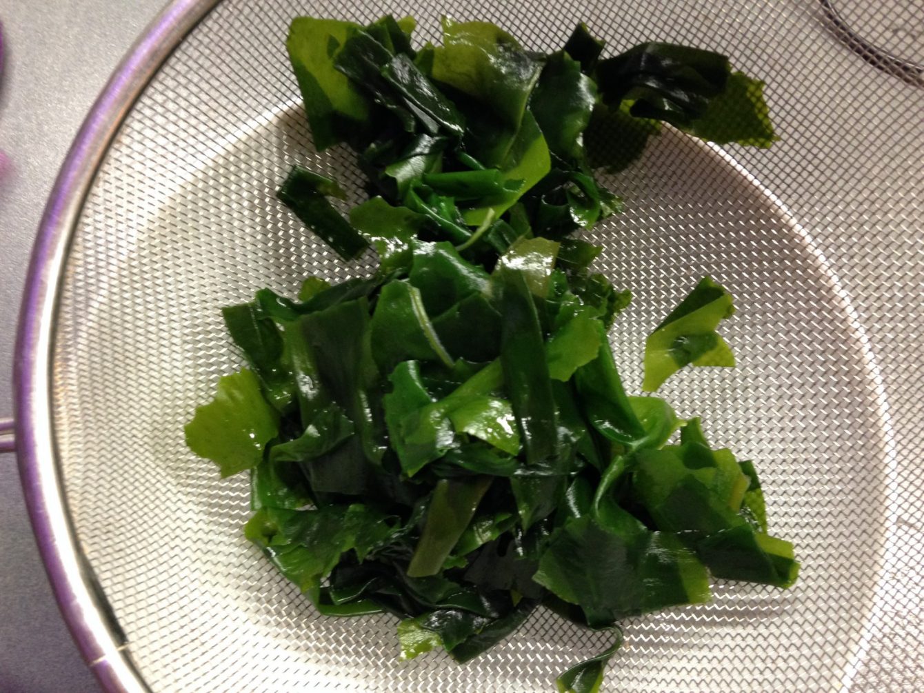 Algen in einem Sieb unter fließendem Wasser abspülen und in einer Schüssel mit heißem Wasser übergießen und ca. 10-15 Minuten ziehen lassen. Abschütten, abtropfen und abkühlen lassen.