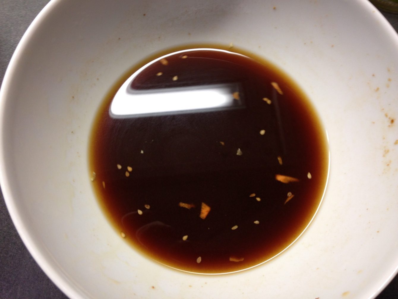 Für das Dressing Miso-Brühe mit Reisessig, Mirin, Sojasoße, Reissirup und Sesamöl vermischen.