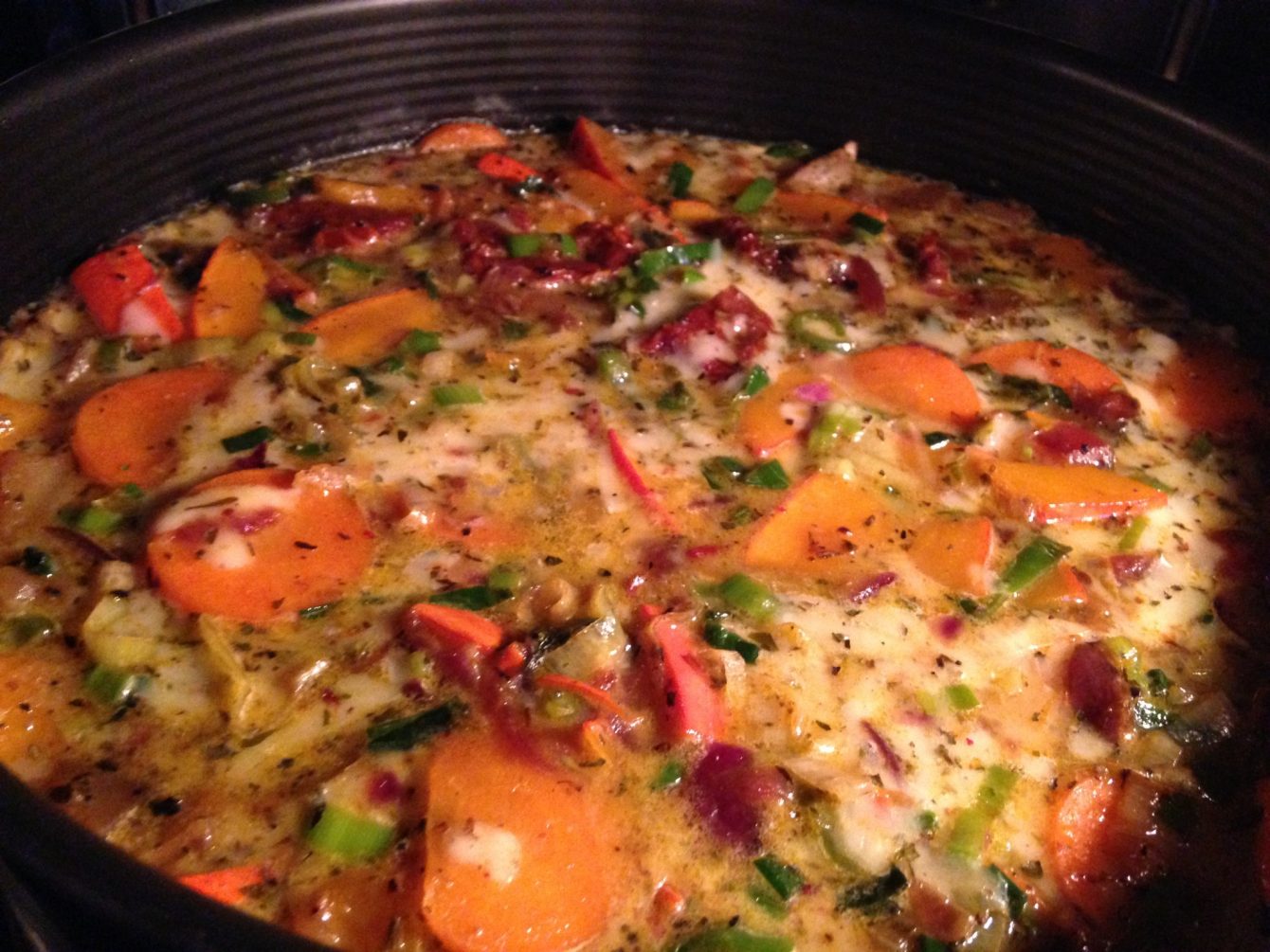 Olivenöl in einer ofenfesten Pfanne erhitzen und Zwiebeln und Knoblauch glasig dünsten. Lauch, Möhren, Kürbis zugeben und 5 Minuten dünsten. Paprika hinzugeben und mit Salz und Pfeffer würzen und weitere 5 Minuten bißfest braten.