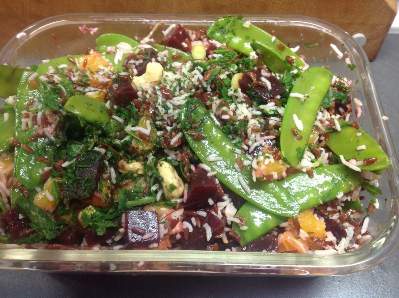 Reis, Erbsenschoten, Rote Bete, Orangen und Cashewkerne vermischen.
