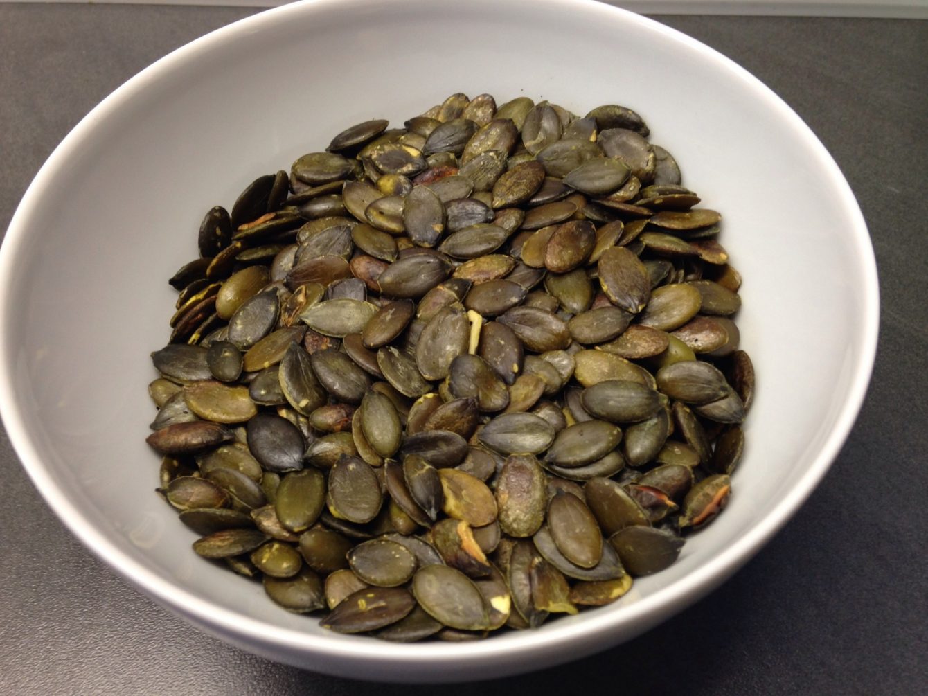 Kürbiskerne in einer Pfanne ohne Fett rösten und über das Lauchgemüse streuen.