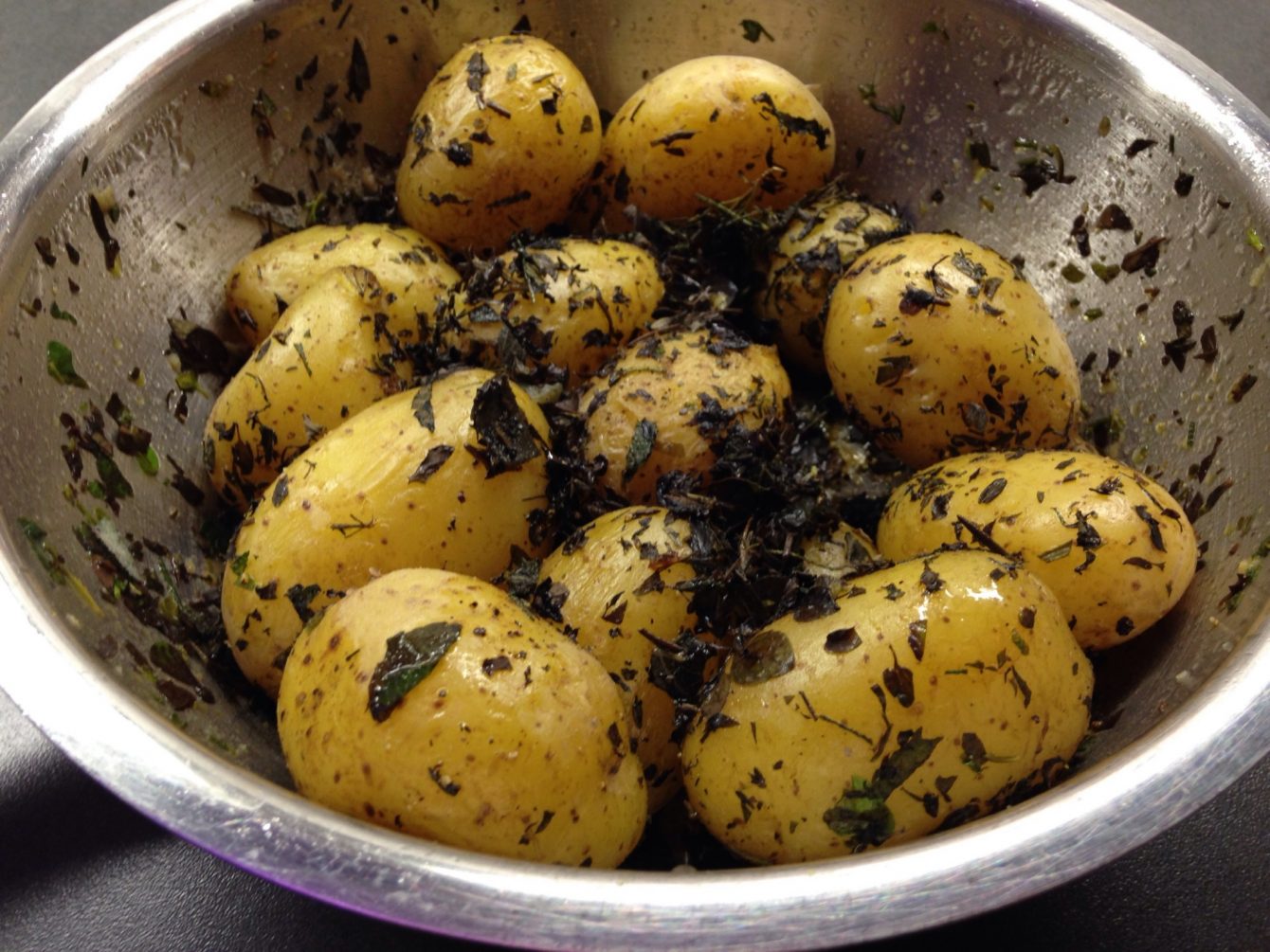 In der Zwischenzeit Öl in einer Pfanne erhitzen und die gekochten Kartoffeln mit Schale zusammen mit den Kräutern kurz schwenken, etwas ziehen lassen, mit Pfeffer und Salz abschmecken.