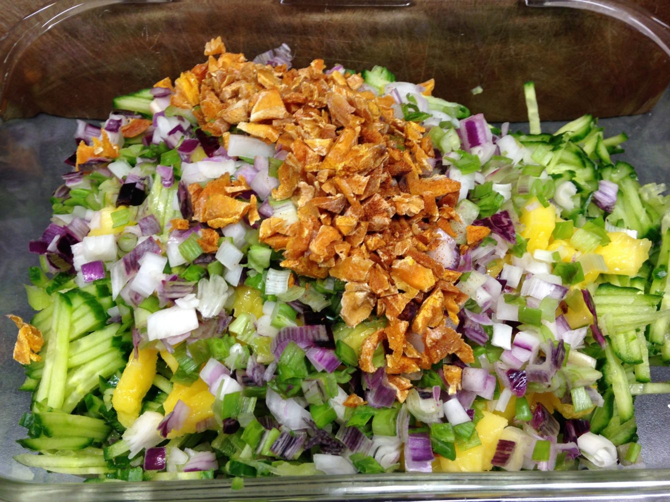 Heute habe ich eine neue Salatkreation ausprobiert, denn ich hatte noch ein Gurke aus meinem Etepetete Paket, die ich irgendwie verarbeiten musste. Zuletzt habe ich meist arabischen Gurkensalat mit Joghurt und Rosinen gemacht. Jetzt musste eine neue Idee her. Eine Mango hatte ich auch noch. Mango, Ingwer und Gurke passen immer gut zusammen, das habe ich kürzlich mit meinen Mango Gurken Quinoa Salat getestet. Also habe ich diesmal wieder eine asiatische Variante probiert. Zusammen mit gebratenem Sesam Tofu und einem Erdnuss Chili Dressing ergab dies einen pikanten, sättigenden Bürosalat, der sich gut vorbereiten lässt. Allerdings sollten Eure Kollegen dafür knoblauchresistent sein, aber das trifft wohl für die meisten meiner Gerichte zu.