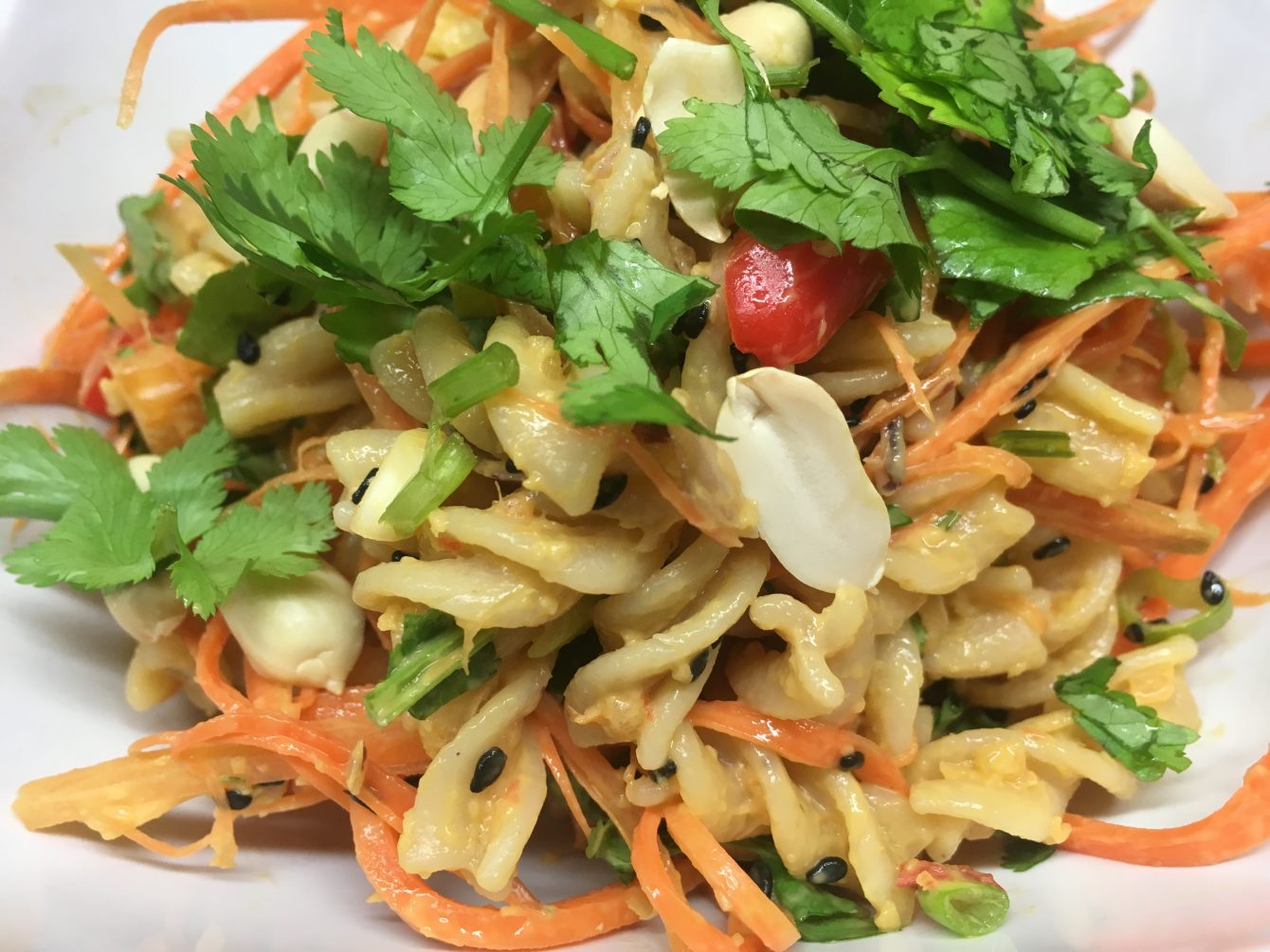 - Den Salat mit Schwarzem Sesam, gerösteten Erdnüssen und Korianderkraut garniert servieren und genießen.