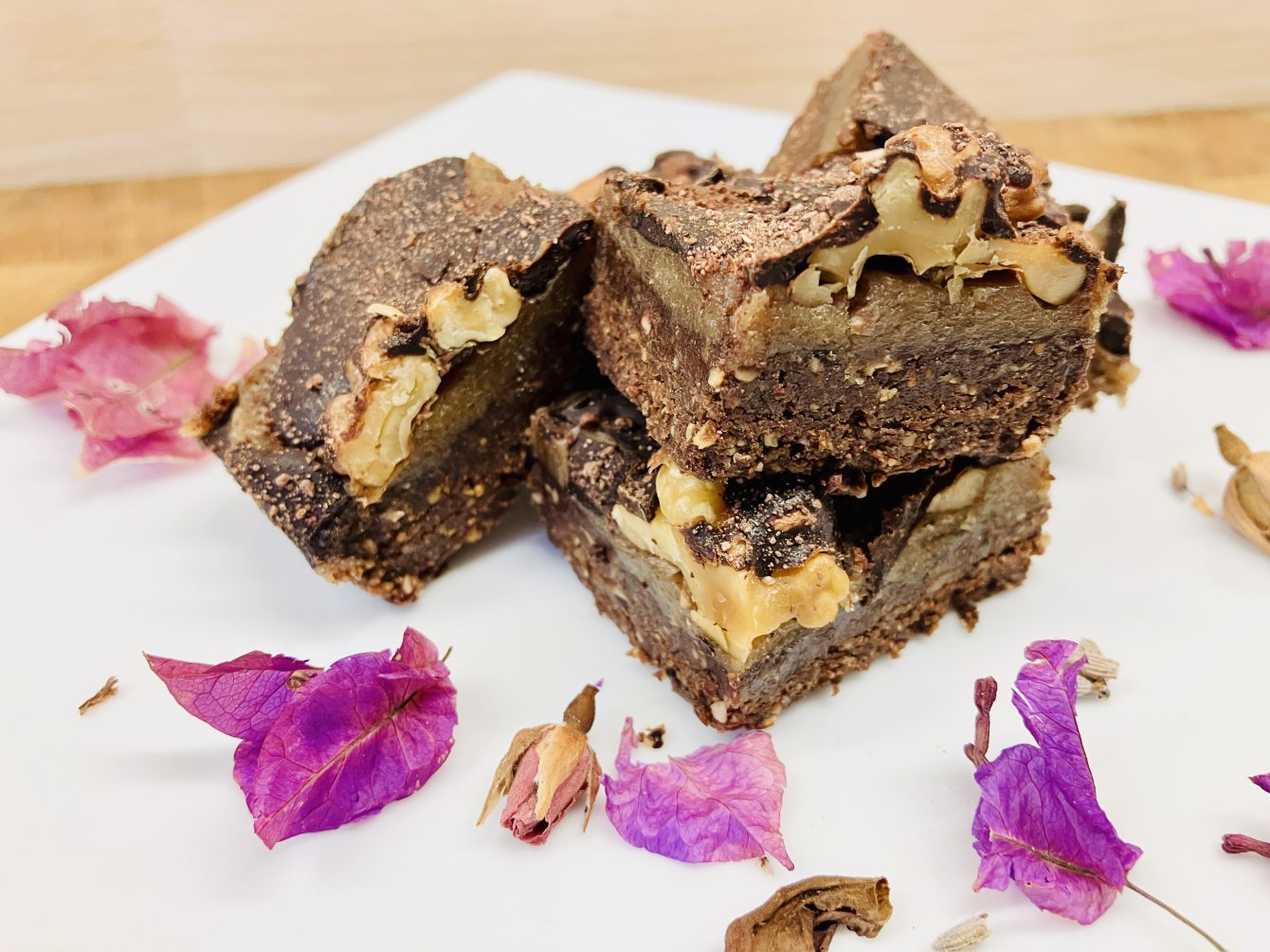 Diese veganen No-Bake Walnuss-Karamell-Brownies sind der Inbegriff eines himmlischen Snacks. Mit einem schokoladigen Brownie-Teig gefolgt von einer Karamellschicht und dem knusprigen Walnuss-Schoko-Topping sind sie verführerisch und gesund zugleich.