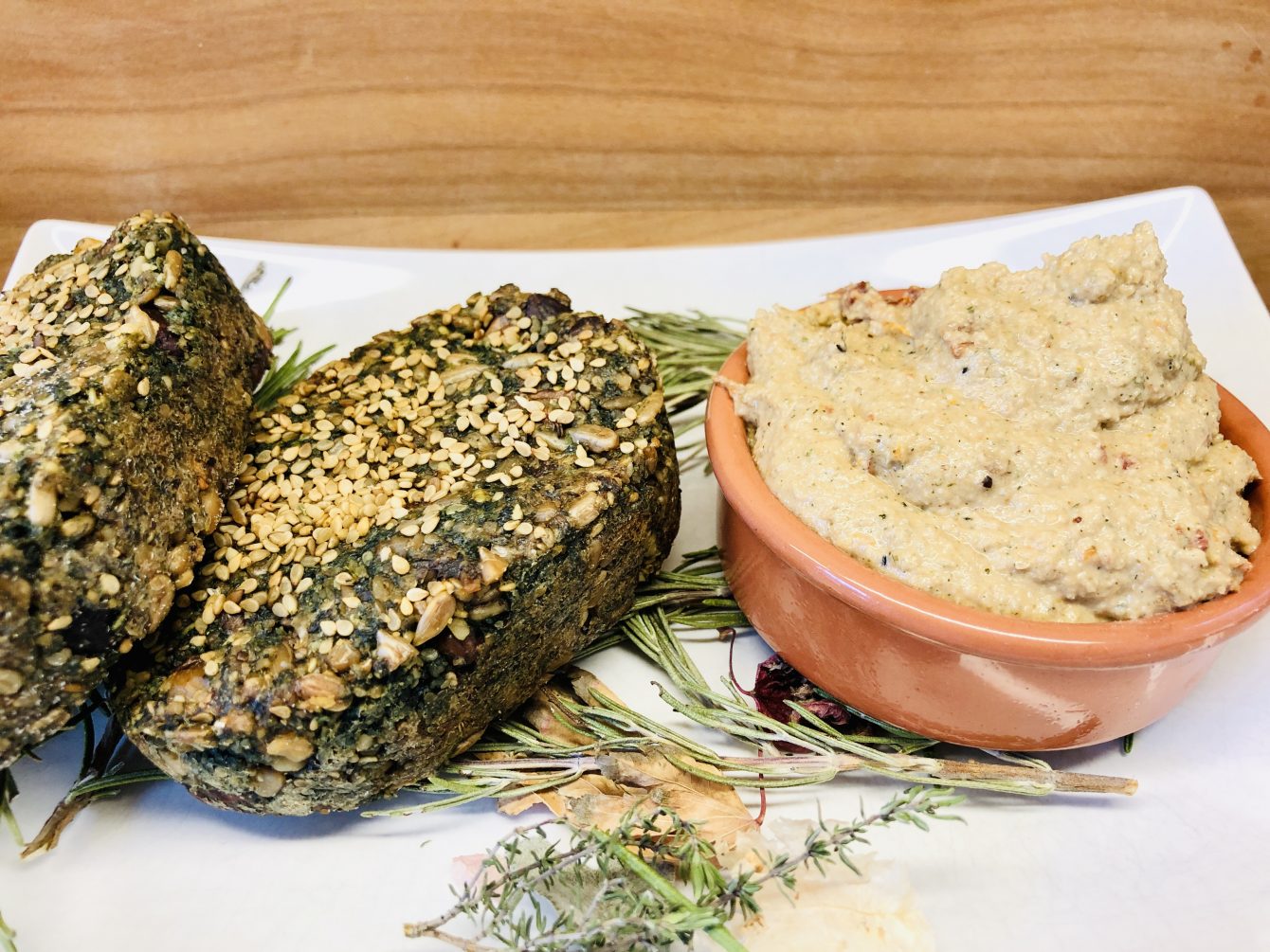 Die Zutaten sind Hanfsamen, eingeweichte Sonnenblumenkerne, etwas Cashew- oder Mandelmus, etwas Miso oder Hefeflocken, etwas Essig und Ahornsirup, eingeweichte, getrocknete Tomaten und Kräuter nach Wahl. Dann alles in den Mixer und fertig ist der leckere Dip.