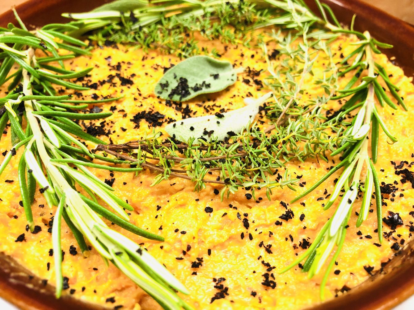 - Die Linsen-Füllung in eine feuerfeste Ofenform geben und glattstreichen. Anschließend das Püree darüber geben und ebenfalls glattstreichen. Mit ein paar Zweigen Rosmarin, Thymian und Salbei bedecken und mit etwas Olivenöl und Paprika oder Chili Flocken bestreuen.