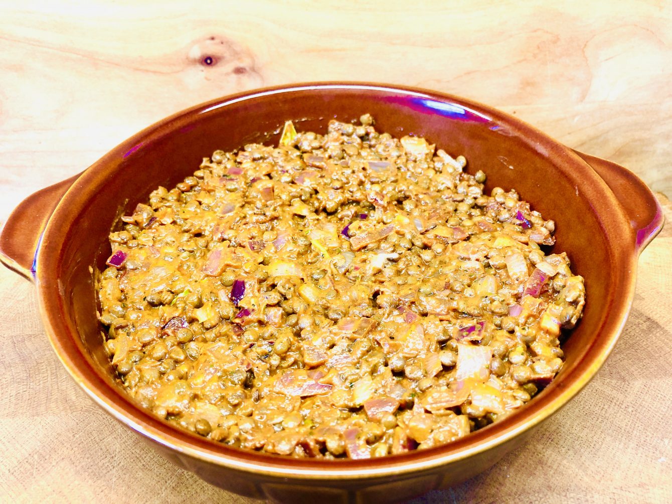 Der Shepherd’s Pie ist eine Auflauf-Spezialität aus der englischen Küche. Diese vegane Version des Hirtenauflaufs besteht aus Linsen, Zwiebeln und Kartoffelpüree.