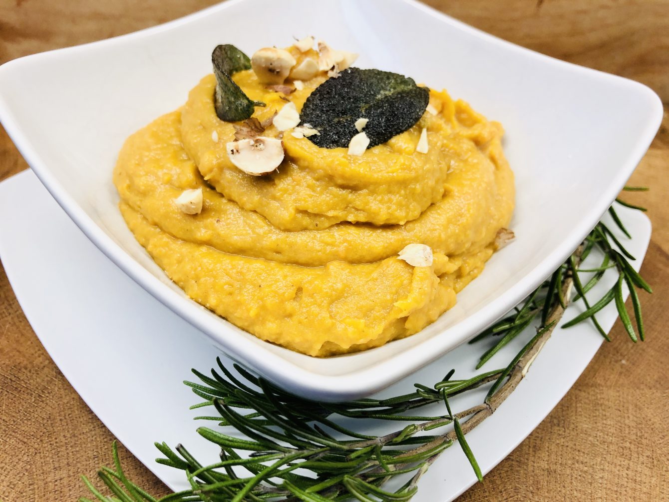 Dieses vegane Süßkartoffel Püree mit Haselnüssen und Salbei ist die ideale Beilage für eine festliche Tafel.