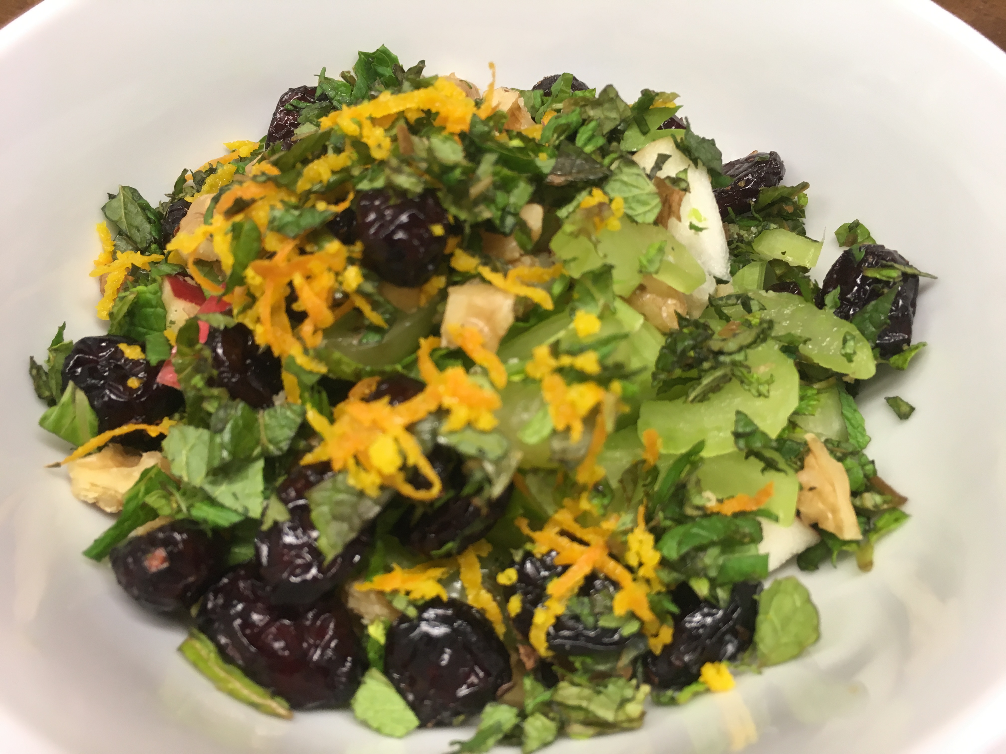 1. Sellerie Stauden in feine Streifen schneiden. Apfel entkernen und würfeln, Walnüsse grob hacken, Minze fein hacken, Zitrone abreiben und auspressen. Alle Zutaten für den Salat in einer Salatschüssel vermischen.