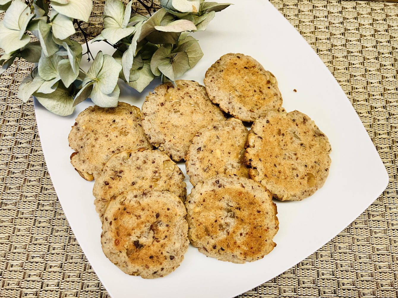 - Teig herstellen: Das Lein-Ei in die Schüssel geben und mit der Cashewbutter und Thymian vermischen. Anschließend das Reismehl, das Kastanienmehl und das Backpulver hinzufügen und zu einem glatten Teig verarbeiten. Zuletzt die gehackten Walnüsse und den zerbröselten Käse vorsichtig unterheben.