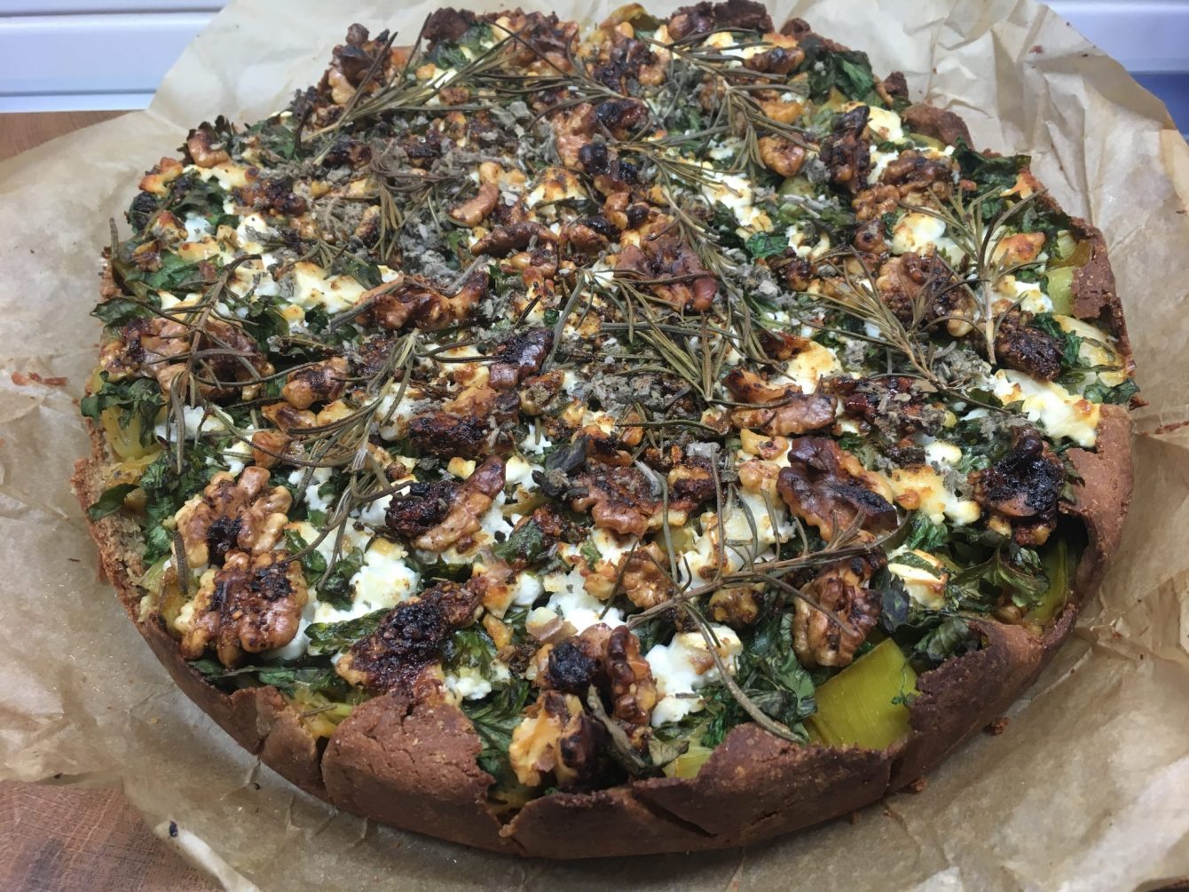 - Das Lauchgemüse in die Tarteform geben und mit dem frischen Rosmarin, dem Ziegenkäse und den Walnüssen bestreuen.