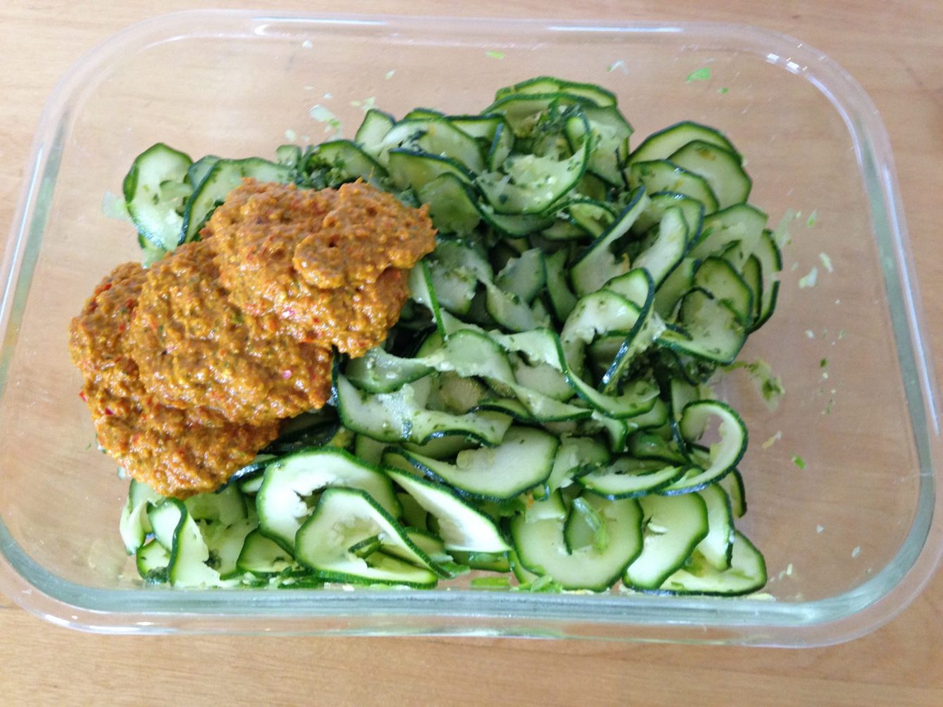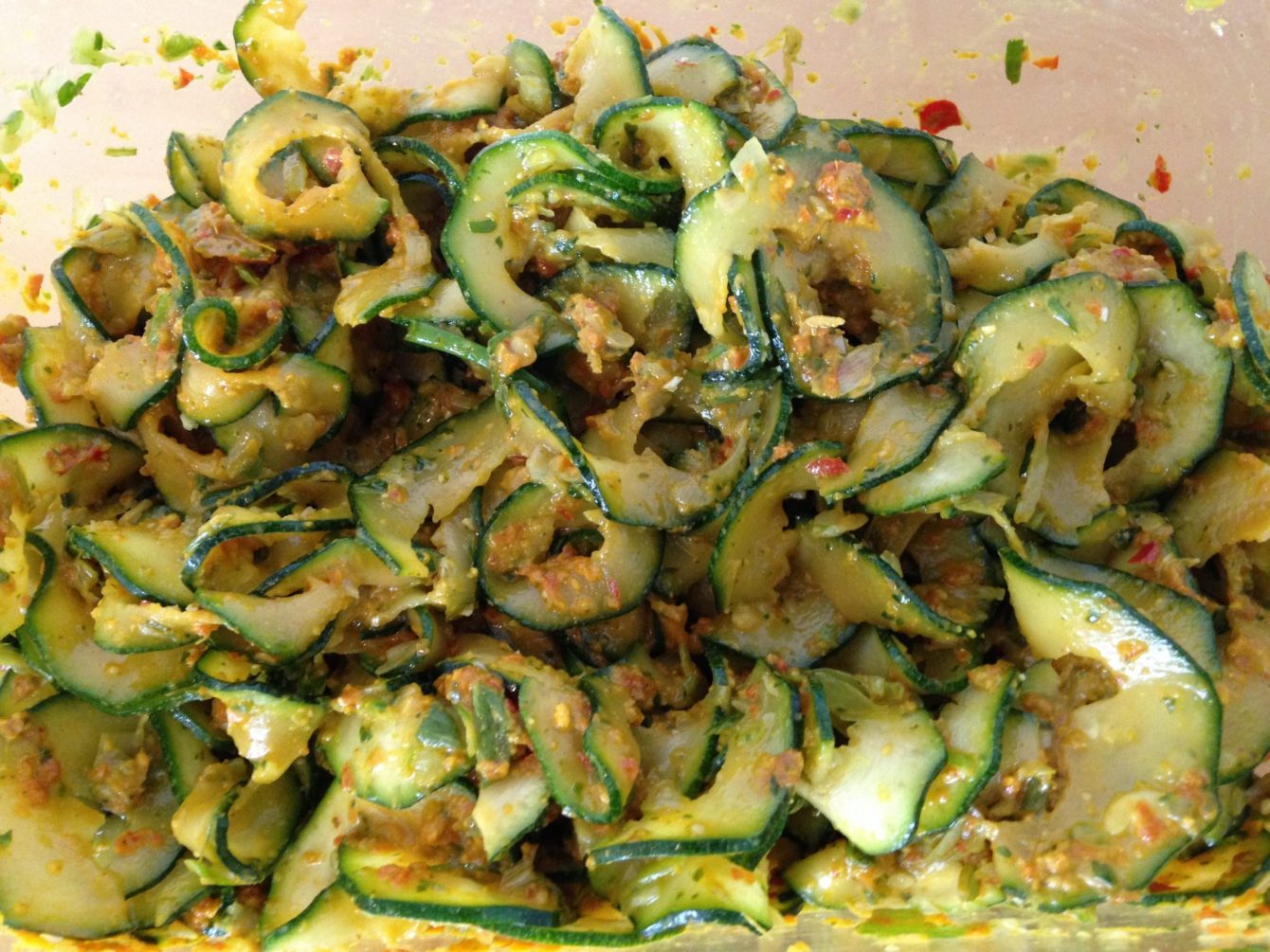 Für den Rohkost Salat die Paprika Erdnuss Chili Sauce über die Zucchini geben (Ihr braucht nur ungefähr die Hälfte der Sauce) und gut vermischen. Eventuell mit frischem Koriander und Minze bestreuen und servieren. Lecker!