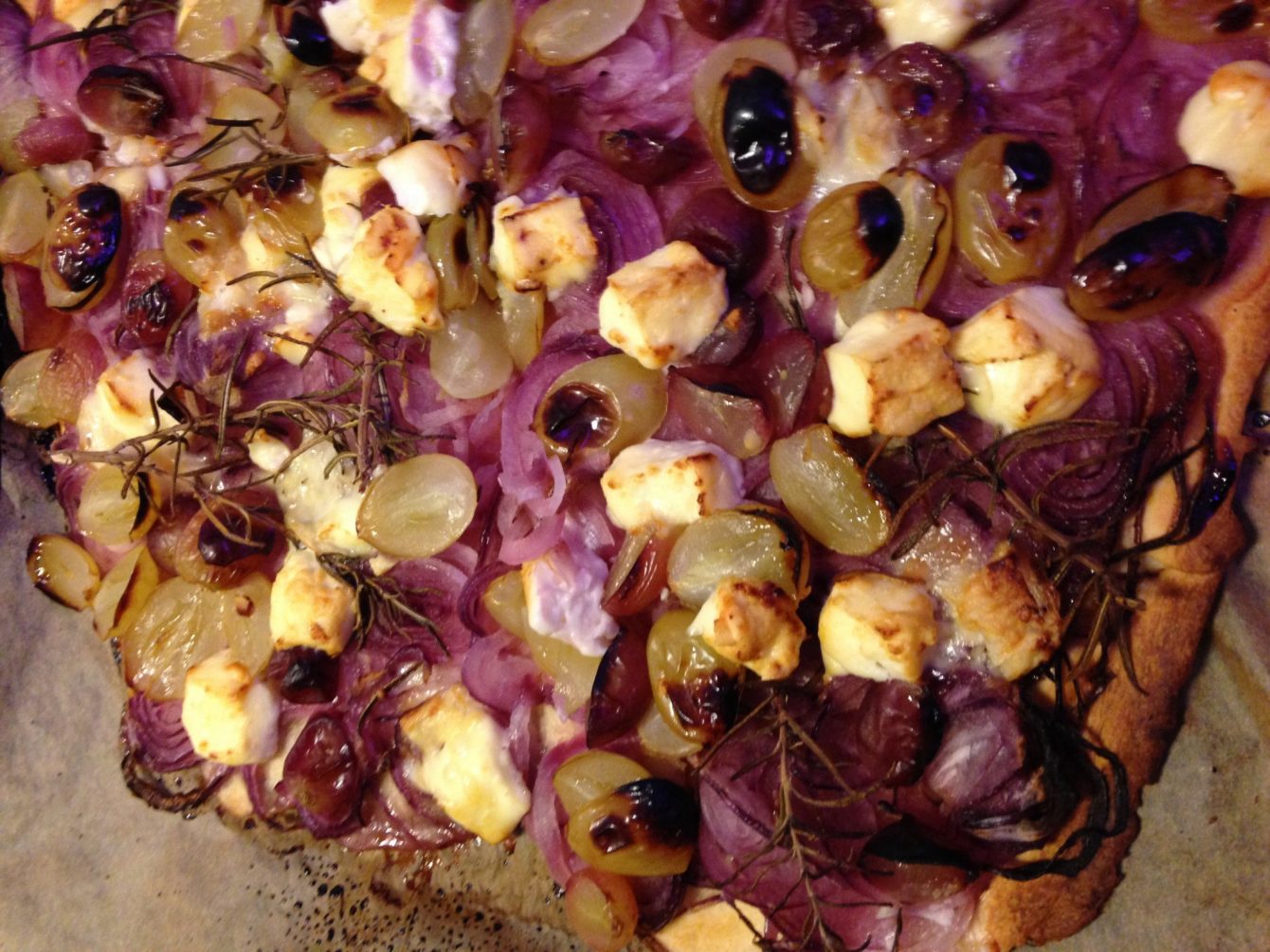 Den aufgegangenen Teig nochmals verkneten und mit einer Teigrolle auf eine Pizzablech ausrollen. Backblech mit Backpapier auslegen und den Teig auflegen. Noch einmal 20 Min. gehen lassen. Mit Zwiebeln, Trauben, Schafskäse und Rosmarin belegen und etwa 25 Minuten bei 180 Grad ausbacken.